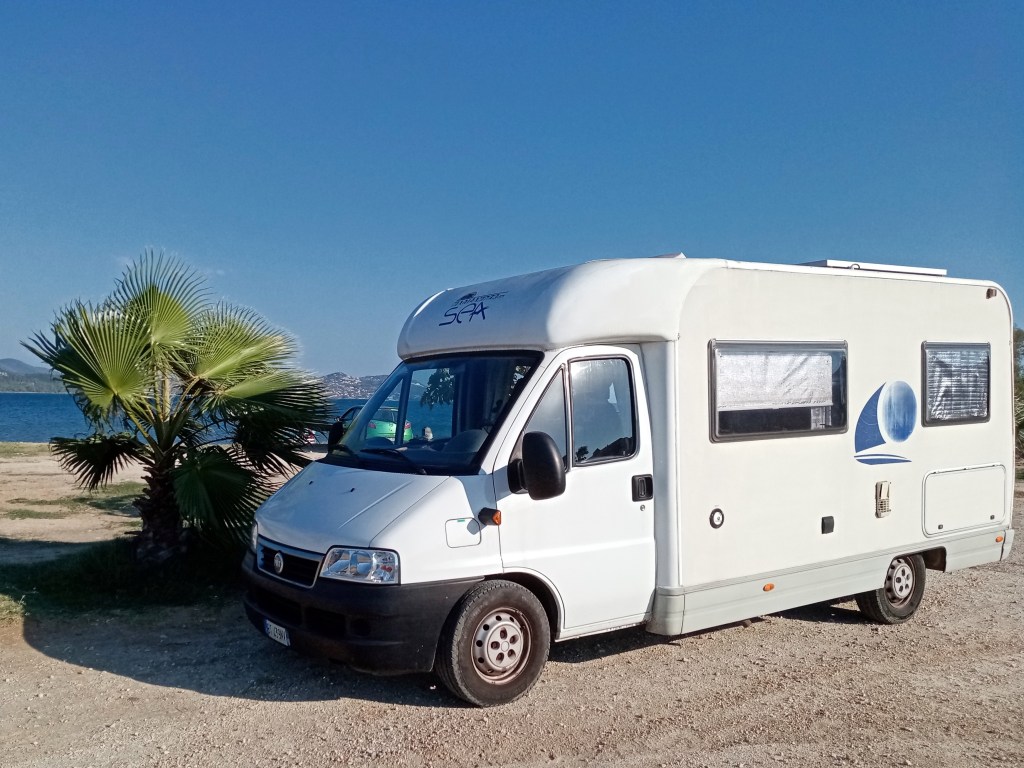A settembre del 2025 siamo tornati a Cefalonia. Dopo un lungo andirivieni in cerca di una sistemazione, abbiamo raggiunto un ampio parcheggio verso la fine dell’abitato, a ridosso della spiaggia. Nessun divieto, abbiamo parcheggiato su un tratto di sterrato a limite del prato che degrada verso la riva. Mare bello, doccia e spogliatoio a disposizione della spiaggia libera, un piccolo beach bar. Tutto molto tranquillo – forse perché fuori stagione. Di notte un po’ di fastidio per lo scorrazzare di motorini.