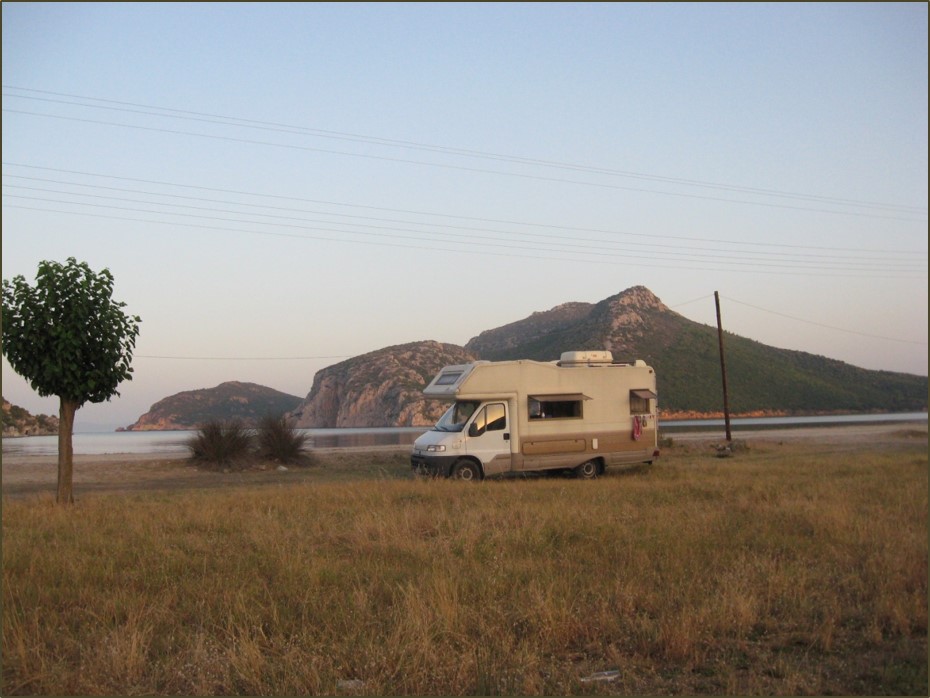A detta di tutti, è difficile sistemare liberamente il camper nella più occidentale delle tre penisole della Calcidica, la Kassàndria. Ciononostante ci siamo azzardati a cercar posto per la notte facendo il giro da ovest a est, e trovando una sistemazione tranquilla nel bel villaggio di Loutrà, turistico senza esagerare. Sosta nei pressi della chiesetta di Àgios Nikolaos, circondata da un bel parco alberato. Fontanella in piazza, docce sulla piccola spiaggia attrezzata, vista sul tramonto.