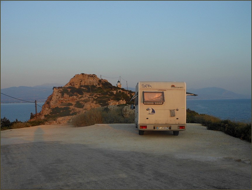 Iràion non si può descrivere: bisogna solo ringraziare chi ha deciso di rendere il luogo accessibile gratuitamente, e predisporre il piazzale dove abbiamo sostato tre volte in assoluta solitudine, almeno dal tramonto fino alle 10 circa del mattino. Non vi sono alberi, ma con un po’ di intelligenza geografica il camperista edonista trova la soluzione per evitare di arrostire sull’asfalto. C’è un rubinetto alle spalle dell’unico edificio visibile dal piazzale, accessibile a piedi. Il resto, è tutto da godere.