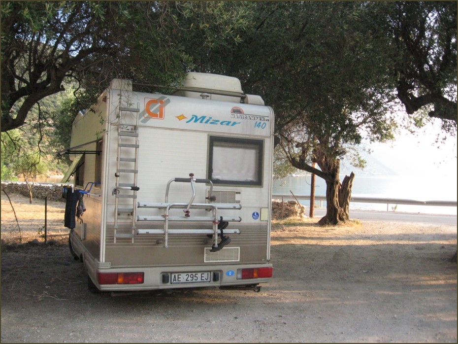 Sbarchiamo a Itaca provenendo dal piccolo porto di Fiskardo su Cefalonia. Due strade si aprivano sulla banchina e scegliemmo la meno battuta, a sinistra, seguendo il mare in direzione di Kioni. Dopo un paio di chilometri la strada si fa strettissima e sale nell’interno, a Kioni non c’è modo di raggiungere il mare e dunque faticosissimo dietro front. Al tramonto stava seguendo repentina la notte, e senza indugio scegliamo un punto dove la strada si allarga, a ridosso di una minuscola baia, raggiungibile dalla strada attraverso una scaletta. Scopriremo al mattino un mare di incantevole bellezza, chiuso tra due basse bianchissime scogliere. Nessun servizio, ma niente paura, il camperista edonista si gode quello che il viaggio dà.
