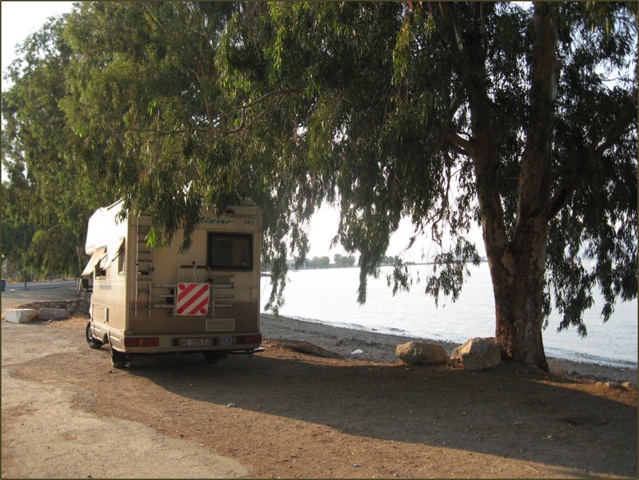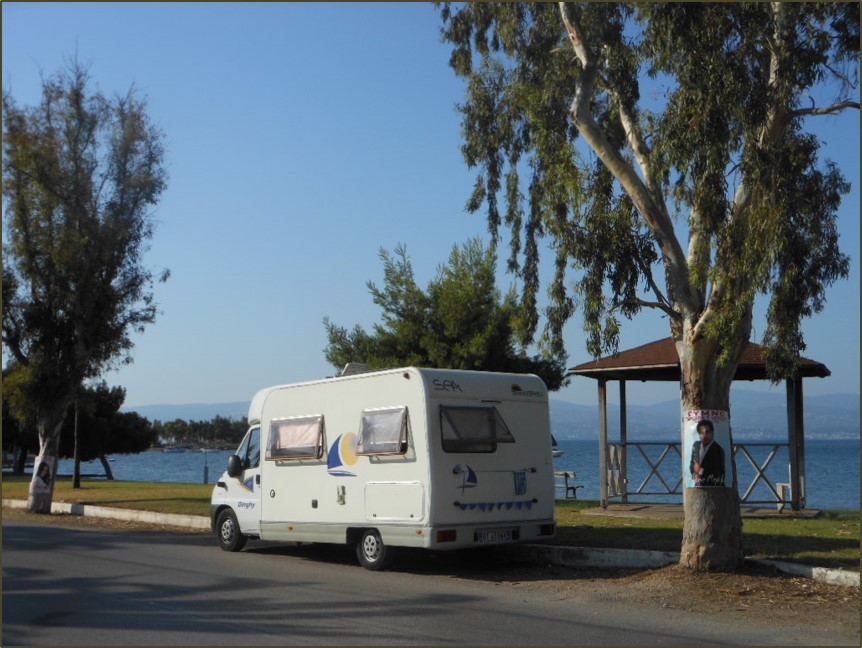 Sosta possibile nei pressi degli scavi, e dunque lontano dalla costa; oppure sul viale di eucalipti che costeggia la città arrivando da Chàlkida, in modo da rinfrescarsi in mare dopo le fatiche culturali. Doccia e fontana sulla spiaggia libera di fronte ai giardinetti appena entrati in paese.