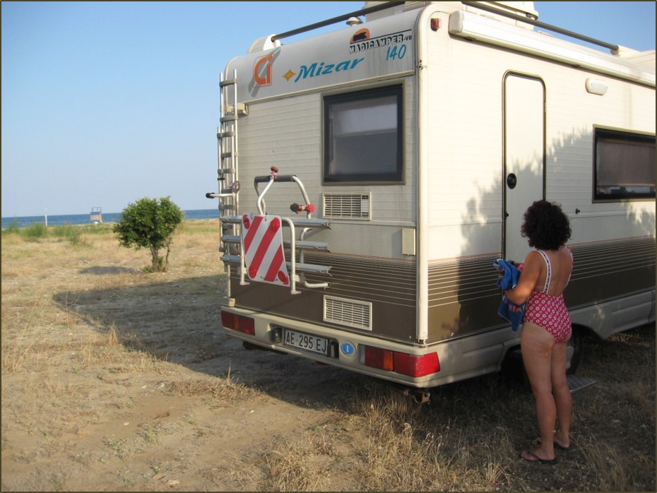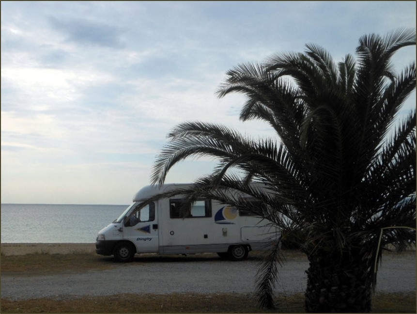 Nel 2009 non c’era ancora l’Egnàtia Odòs, ed arrivavamo dalla frontiera di Euzòni. Il nostro obiettivo era la Calcidica. Superata la periferia nord di Thessalonìki, proseguimmo sulla statale 2, costeggiando i laghi di Koronìa e di Volvi, e giunti al mare che era ormai sera ci fermammo a Serraikì Aktì infilandoci tra le case sulla destra della nazionale, subito dopo il campeggio. Altre volte abbiamo fatto brevi soste nei paesi del golfo di Orfanì per rifornirci di acqua o viveri. Nessun problema a parte un po’ di affollamento ad Asprovàlta, con una lunga teoria di camper in prossimità di un blocco servizi vandalizzato. Sulla larga spiaggia le docce non mancano, fondo di sabbia grossolana, mare pulito e subito profondo.
