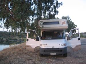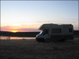 Entriamo in Spagna da Ovest, all’altezza di Badajoz dove prendiamo la N-5. Non sembra di aver cambiato paese, il paesaggio dell’Estremadura è praticamente identico a quello della regione di Evora, ed anche le presenze romane di quella città si replicano in questa, anche lei Patrimonio UNESCO. Mentre scendono le prime ombre della sera, a Merida imbocchiamo la Autovìa de Extremadura A-5, per niente trafficata. Dopo circa 150 km in questa terra estrema, aspra e selvaggia, intravediamo dall’alto di un viadotto un singolare lago artificiale e un terreno dove potremmo piazzarci per la notte invece di approfittare del distributore lì nei pressi.
