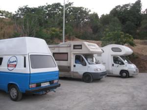 Usciamo ad Almaraz, attraversando le casette basse e bianche di un centro che a prima vista deve aver avuto una sua nobile storia. Ritroviamo la N-5, e superata sulla destra una centrale atomica svoltiamo a sinistra in direzione del Tago. Dopo uno stretto ponte al centro di una curva a gomito, la strada si allarga e notiamo questo gruppo di costruzioni chiaramente abbandonate ed una larghissimo piazzale sterrato. Un cartello indica la direzione per il Puerto (passo) de Miravete. Per una volta tanto, non è ancora notte. Il posto è molto tranquillo come piace a noi, praticamente sulla statale non passa nessuno. Niente acqua né servizi, ma abbiamo le nostre scorte e possiamo reggere, anche perché la prossima tappa sarà una città. Ma intanto ci godiamo la pace del tramonto in questo posto senza nome.