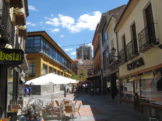 Recuperiamo l’A-5, entriamo nella Mancha di Don Quixote e lasciamo l’Autovìa a Velada, per andare a prendere la N-502. Dopo una cinquantina di km la strada sale verso la Sierra de Gredos. Il paesaggio da brullo diventa verdissimo, ci sfilano via castelli e borghi fortificati. Verso le 11 sosta tattica a una fontana un po’ prima di Puerto del Pico (1352 m s.l.m.). Verso il fondovalle si vedono chiare le tracce di una antica strada romana. Si riparte e dopo una decina di km nuova sosta a godersi la frescura in mezzo agli alti pascoli della Sierra: mucche a destra, mucche a sinistra, il paesaggio familiare degli alpeggi nostrani. La strada scende per qualche km e poi risale al Puerto de Menga (1564 m s.l.m.). Poi scende ancora verso Àvila (1131 m s.l.m.), uno degli obiettivi della giornata, circondata da campi di grano.