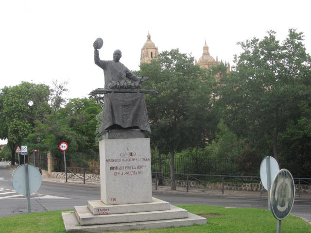 Distratti da un mega Lidl dopo alcune settimane di astinenza, lasciamo Àvila verso le otto di sera, destinazione Segovia (1105 m s.l.m.). Che raggiungiamo dopo circa un’ora, bella come nel quadro di El Greco nella luce del tramonto. La costeggiamo e ce ne allontaniamo, sperando di poterci fermare per la notte in uno slargo davanti al Palacio Real de Riofrio, ma i carabineros di servizio ci mandano via con cortese fermezza. Non abbiamo alternative, e allora cerchiamo la sosta in centro. Nulla di più facile: un paio di giri sugli stretti viali ai piedi della città murata, e finalmente un posto libero in un grande parcheggio in pieno centro, sterrato ma gratuito, a lato della rotonda con il monumento al famoso cuoco Candido, “mesonero major de Castilla”. Niente acqua né servizi, ma va benissimo così. Siamo in tre camper in mezzo ad altre vetture e moto. In uno, con targa spagnola, abita una frotta di marmocchi che giocano a nascondino tra le vetture mentre la madre prepara la cena.