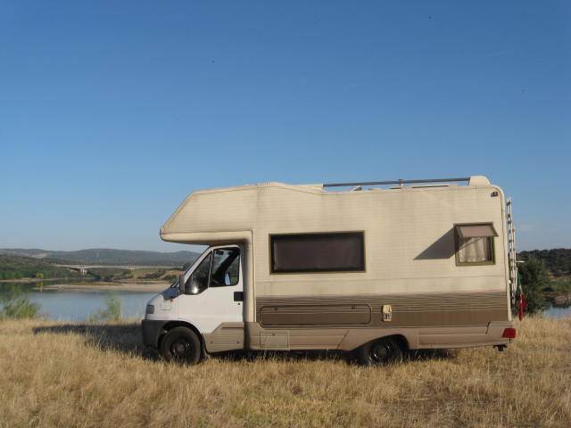 Entriamo in Spagna da Ovest, all’altezza di Badajoz dove prendiamo la N-5. Non sembra di aver cambiato paese, il paesaggio dell’Estremadura è praticamente identico a quello della regione di Evora, ed anche le presenze romane di quella città si replicano in questa, anche lei Patrimonio UNESCO. Mentre scendono le prime ombre della sera, a Merida imbocchiamo la Autovìa de Extremadura A-5, per niente trafficata. Dopo circa 150 km in questa terra estrema, aspra e selvaggia, intravediamo dall’alto di un viadotto un singolare lago artificiale e un terreno dove potremmo piazzarci per la notte invece di approfittare del distributore lì nei pressi.