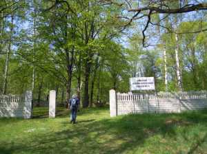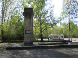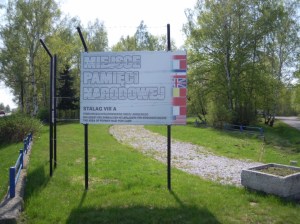 Siamo in Polonia, e mi stupisce l’assenza di indicazioni in questa parte della città, che pare molto trascurata. Cosa fai quando sei a corto? Chiedi a un distributore. Così è, scambio di battute con qualche avventore e subito un ragazzo con un furgone ci indica di seguirlo e poi ci lascia a una rotonda segnalandoci la direzione da prendere. Dopo un va e vieni in mezzo ai campi e alle officine, finalmente compare quasi dal nulla, e devo dire inaspettata, l’area memoriale dello Stalag VIII-A. Non abbiamo nessuna idea di quanta strada dovremo ancora fare e di come siano le strade in questa parte di Polonia, ma visitiamo in profondità questo luogo, dotato di un grande parcheggio sterrato. Il monumento è molto austero, sovietico. Vi sono panelli e foto che illustrano l’impianto carcerario in tempo di guerra. C’è un percorso che attraversando un bosco di betulle dove sono ancora visibili alcune tracce dei baraccamenti si spinge fino a un piccolo cimitero dei prigionieri di guerra sovietici. C’è, in fondo al bosco, una lunga teoria di pali di cemento e filo spinato. Il memoriale è deserto, e questo fa forte contrasto con tutti gli altri luoghi della memoria che abbiamo visitato finora. Restiamo a lungo in silenzio, raccolgo un pezzetto di filo spinato che mi si era impigliato nella scarpa e torniamo al Mizar: è ora di muoverci verso Nowa Ruda.