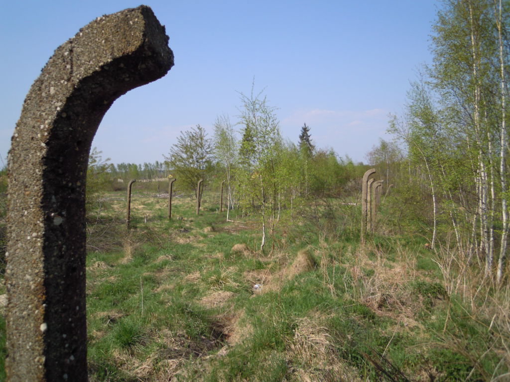 Siamo in Polonia, e mi stupisce l’assenza di indicazioni in questa parte della città, che pare molto trascurata. Cosa fai quando sei a corto? Chiedi a un distributore. Così è, scambio di battute con qualche avventore e subito un ragazzo con un furgone ci indica di seguirlo e poi ci lascia a una rotonda segnalandoci la direzione da prendere. Dopo un va e vieni in mezzo ai campi e alle officine, finalmente compare quasi dal nulla, e devo dire inaspettata, l’area memoriale dello Stalag VIII-A. Non abbiamo nessuna idea di quanta strada dovremo ancora fare e di come siano le strade in questa parte di Polonia, ma visitiamo in profondità questo luogo, dotato di un grande parcheggio sterrato. Il monumento è molto austero, sovietico. Vi sono panelli e foto che illustrano l’impianto carcerario in tempo di guerra. C’è un percorso che attraversando un bosco di betulle dove sono ancora visibili alcune tracce dei baraccamenti si spinge fino a un piccolo cimitero dei prigionieri di guerra sovietici. C’è, in fondo al bosco, una lunga teoria di pali di cemento e filo spinato. Il memoriale è deserto, e questo fa forte contrasto con tutti gli altri luoghi della memoria che abbiamo visitato finora. Restiamo a lungo in silenzio, raccolgo un pezzetto di filo spinato che mi si era impigliato nella scarpa e torniamo al Mizar: è ora di muoverci verso Nowa Ruda.