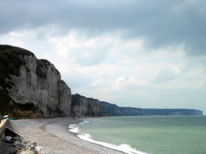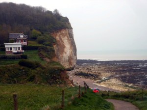 Domenica di Pasqua. Le campane della chiesa di Saint-Pierre, austera e circondata da giardini, suonano a festa. Ci alziamo tardi, colazione e due passi in paese, dove non c’è nulla di aperto tranne la boulangerie. Posto solitario e tranquillissimo, molto gradevole. Piove, ha cominciato stanotte; più che pioggia piovaschi, di quelli che tengono l’erba verde e fresca. Imbocchiamo la ripida Rue de la Plage e scendiamo alla spiaggia di ciottoli neri, sembra quasi ossidiana, ai piedi di alte scogliere di calcare stratificato e mangiucchiato alla base. La bassa marea ha scoperto una larga piattaforma rocciosa che si spinge in mare per un centinaio di metri. Pareti a picco, maestose. Mare poco mosso, pieno di gabbiani. Risaliamo attraverso un viottolo che raggiunge una villa da cui si gode una vista mozzafiato.