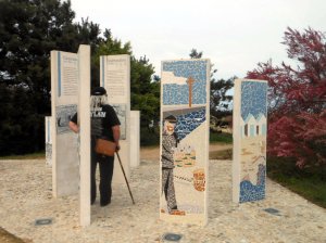 Obiettivo le spiagge dello sbarco, entrambi c’eravamo già stati (io 15 anni fa) ma non in maniera così sistematica come vorremmo fare adesso. La prima spiaggia è Juno Beach, e così ci portiamo a Courseulles-sur-Mer, dove c’è un Memoriale e un Museo. Scegliamo il percorso sulla costa, ben indicato da appositi cartelli, e superiamo il ponte sospeso di Bénouville, che fu teatro di una brillante operazione dei commandos inglesi la notte del 5 giugno del 1944, alla vigilia dello sbarco.