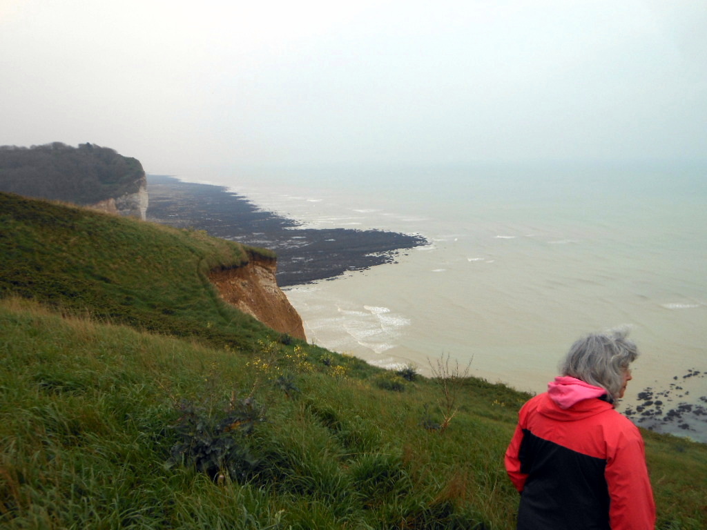 Domenica di Pasqua. Le campane della chiesa di Saint-Pierre, austera e circondata da giardini, suonano a festa. Ci alziamo tardi, colazione e due passi in paese, dove non c’è nulla di aperto tranne la boulangerie. Posto solitario e tranquillissimo, molto gradevole. Piove, ha cominciato stanotte; più che pioggia piovaschi, di quelli che tengono l’erba verde e fresca. Imbocchiamo la ripida Rue de la Plage e scendiamo alla spiaggia di ciottoli neri, sembra quasi ossidiana, ai piedi di alte scogliere di calcare stratificato e mangiucchiato alla base. La bassa marea ha scoperto una larga piattaforma rocciosa che si spinge in mare per un centinaio di metri. Pareti a picco, maestose. Mare poco mosso, pieno di gabbiani. Risaliamo attraverso un viottolo che raggiunge una villa da cui si gode una vista mozzafiato.