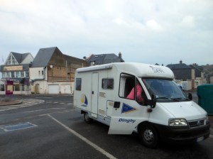 Lasciamo Courseulles e in mezz’ora siamo ad Arromanches-les-Bains. Qui c’è un bel Museo dello Sbarco dedicato soprattutto alla costruzione dell’incredibile porto galleggiante Mulberry Harbour B, conosciuto anche come Port Winston, dove nei giorni immediatamente successivi al 6 giugno 1944 furono sbarcati oltre 2,5 milioni di uomini, 500.000 veicoli e 4 milioni di tonnellate di rifornimenti, facendo così transitare gran parte dei rinforzi necessari per l’avanzata in Francia. Ma prima di arrivare in paese c’è anche un cinema circolare sovrastato da un osservatorio, circondato da un grande parcheggio. Decidiamo di parcheggiare e dormire qui dove c’è il cinema, e domani scendere a piedi in paese per fare due passi sulla spiaggia e visitare il Museo. Ci sono altri due camper, e ci sistemiamo abbastanza lontano, sullo sterrato a fondo erboso, praticamente in mezzo ai campi. Niente acqua né servizi.