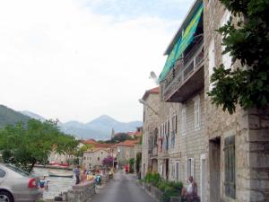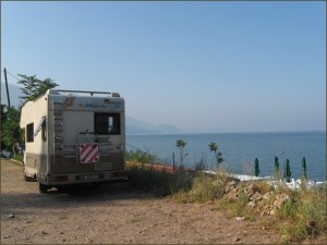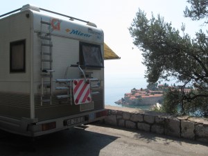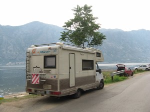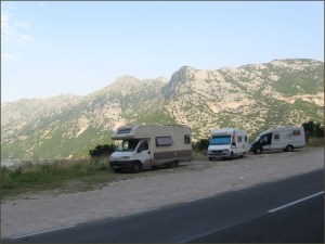 Terza tappa, obiettivo Kotor facendo la strettissima strada costiera che segue le profonde insenature della baia di Risan. Sosta tattica per bagno a Prčanj, parcheggio sulla strada. Superata Kotor, raggiungiamo Risan ma non ci convince, marcia indietro e sosta in ampia piazzola su una curva, probabilmente parcheggio del sovrastante monastero di Banja. Deserta al nostro arrivo, nel giro di mezz’ora arriveranno a farci compagnia altri due camper.
