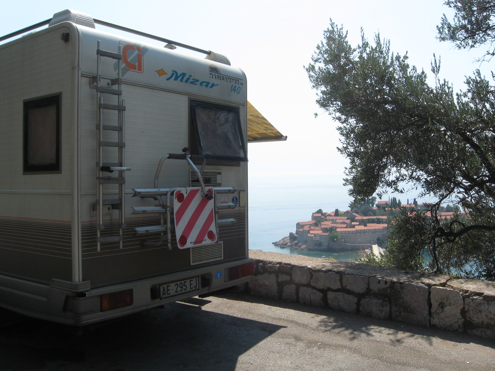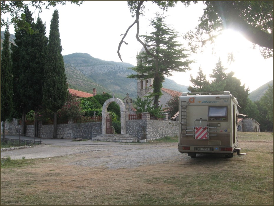 Strade di campagna molto strette, in città più larghe ma molto trafficate. Sosta per la notte a Ulcinj, parcheggio su sterrato in pineta a ridosso degli impianti balneari. Niente acqua né servizi. Al mattino, dopo un bagno veloce (acqua freddissima), visita del castello, interessante. Proseguiamo sulla costa, superando Bar, Buljarica, Petrovac e Sveti Stefan. Cercato inutilmente un posto, dietrofront e sosta per la notte nel parcheggio del Monastero di Rezevici. Acqua a una fontanella dentro il monastero, niente servizi. La strada è tortuosa ma larga e poco trafficata, il fondo stradale non sempre in ordine. Al mattino, visita del monastero, molto interessante.
