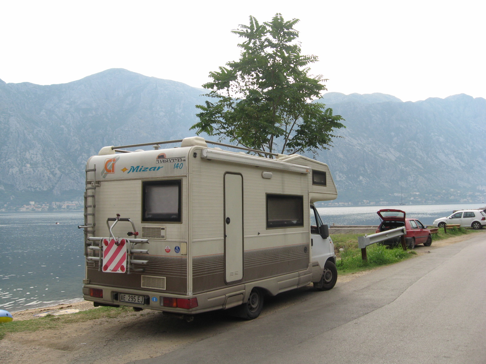 Terza tappa, obiettivo Kotor facendo la strettissima strada costiera che segue le profonde insenature della baia di Risan. Sosta tattica per bagno a Prčanj, parcheggio sulla strada. Superata Kotor, raggiungiamo Risan ma non ci convince, marcia indietro e sosta in ampia piazzola su una curva, probabilmente parcheggio del sovrastante monastero di Banja. Deserta al nostro arrivo, nel giro di mezz’ora arriveranno a farci compagnia altri due camper.