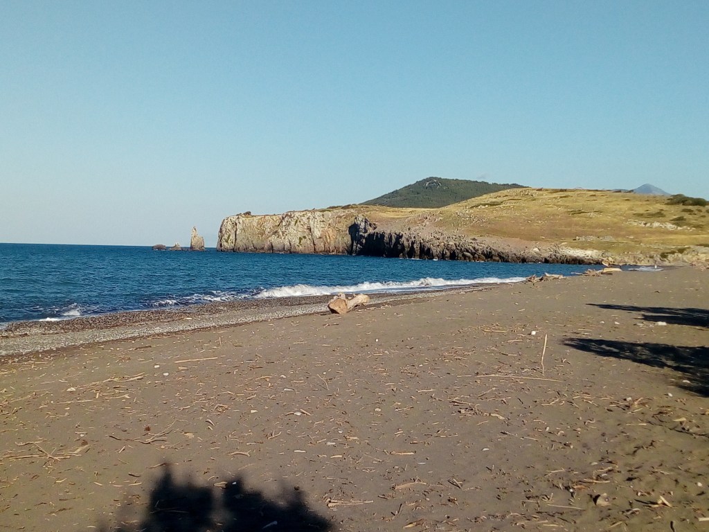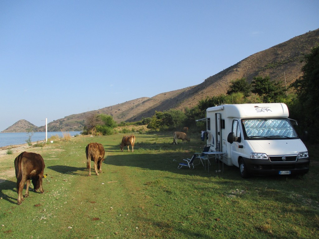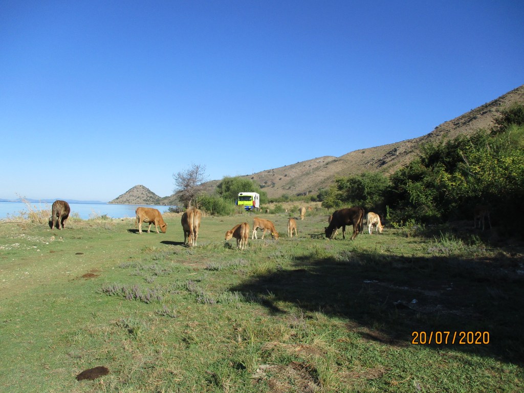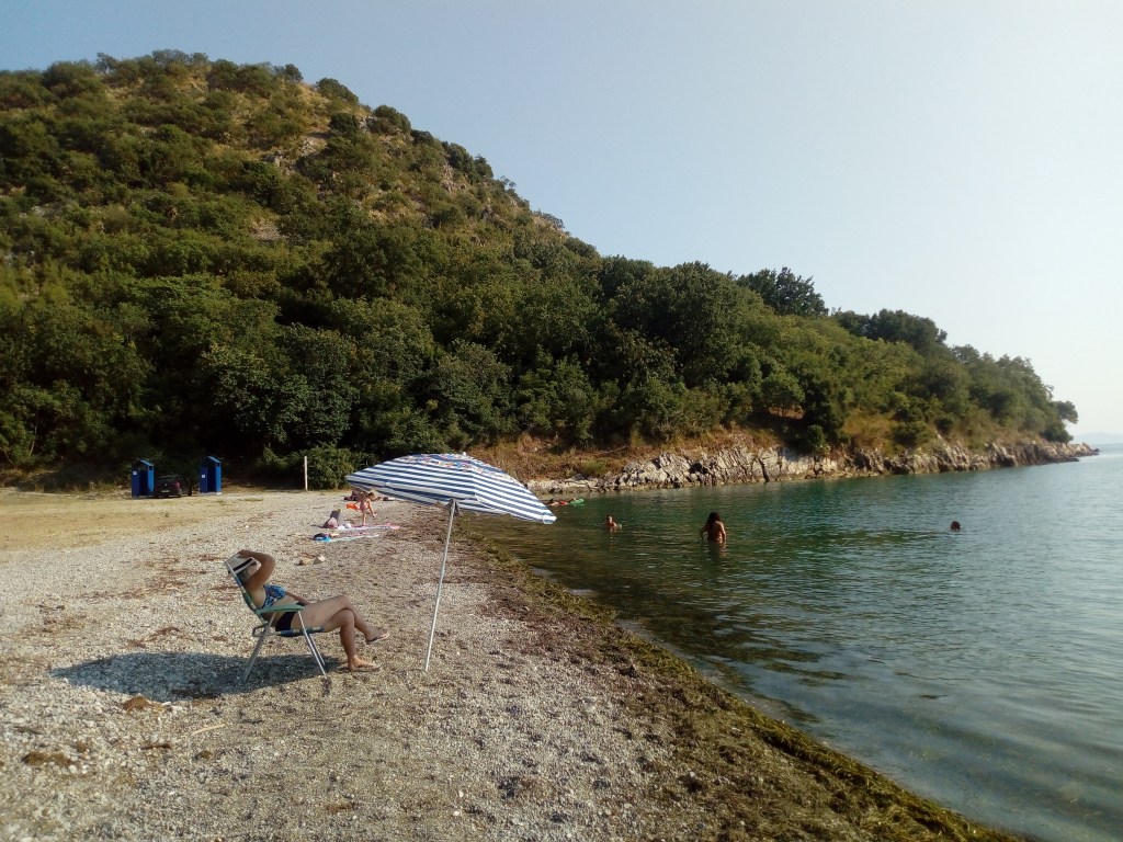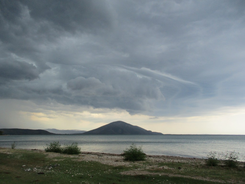 Torniamo a Sagiada in tempo per il pranzo, ma per la prima volta in 11 anni un tizio ci apostrofa in malo modo per mandarci via. Niente di che: già molti anni fa avevamo campeggiato in un’altra postazione qualche km indietro, anche questa provvista di doccia e cassonetto. In pieno sole, ma assolutamente deserta, se si escludono i bovini che due volte al giorno l’attraversano brucando. Erba fino alla riva, mare profondo e azzurro, una doccia spettacolare con acqua abbondante e freddissima come se sgorgasse direttamente dal sottosuolo. Dobbiamo ringraziare quell’unico greco malmustoso che ci ha “obbligato” a scoprire questo sito: la riva è quasi indenne dalla solita presenza di plastiche di ogni tipo, spiaggia di ciottoli come l’altra, ma appena entrati il fondo è morbido e pieno di vita. Bella anche la vista sul golfo, molto affascinante quando domenica ci raggiunge un temporale, che in pochi minuti passa e va.
