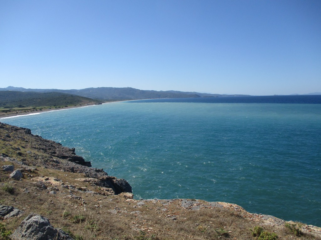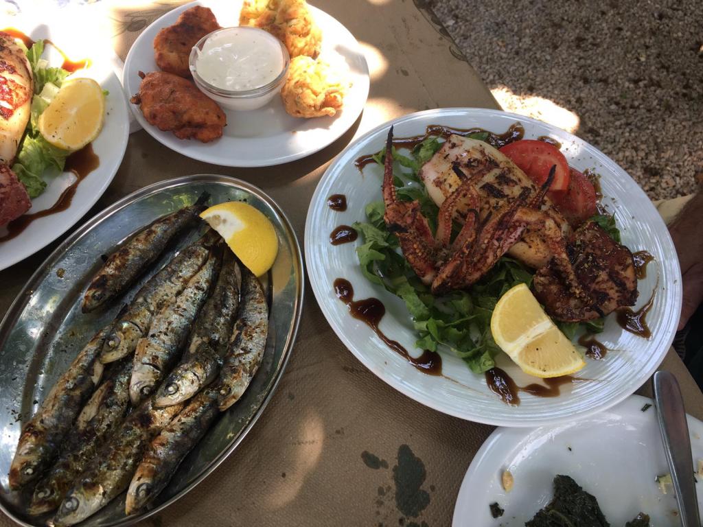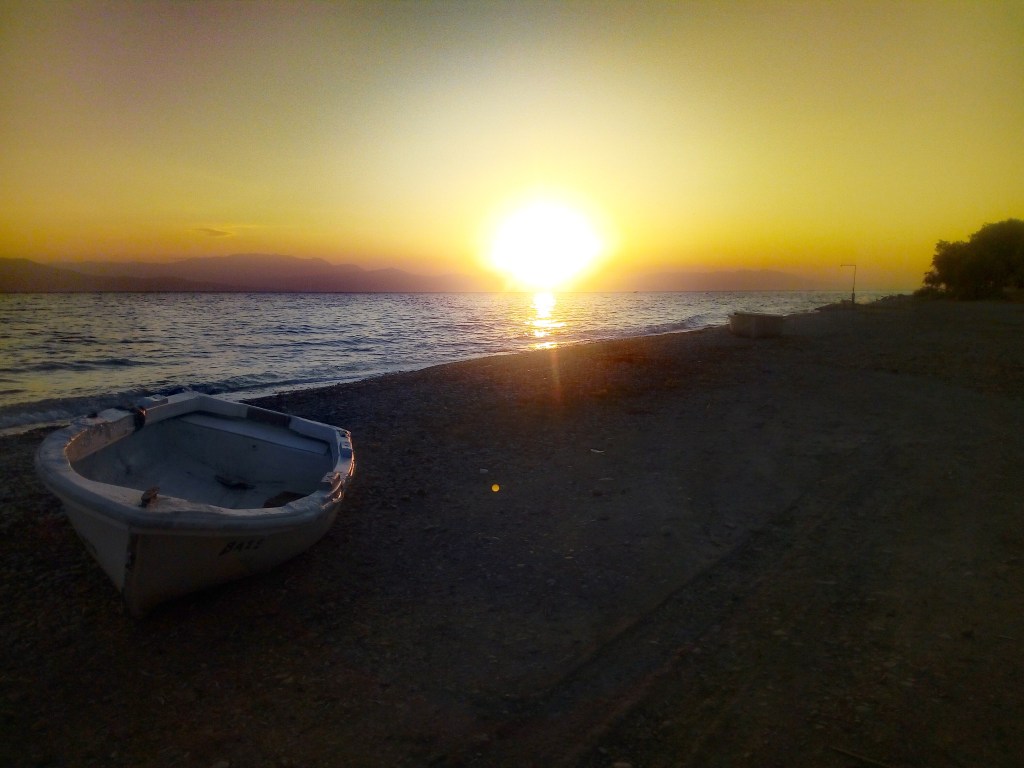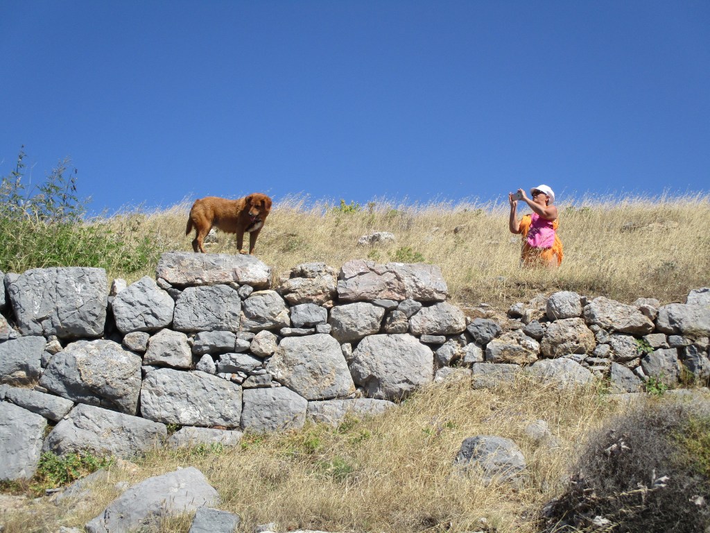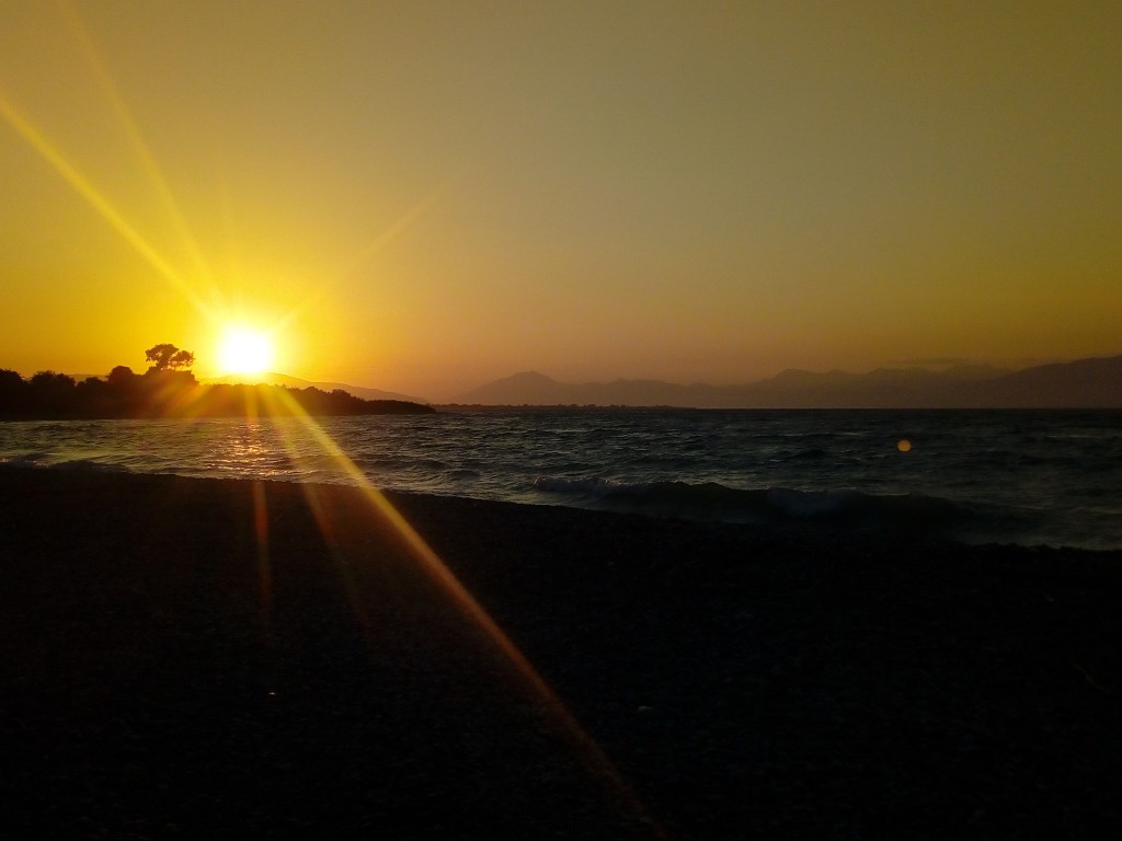 Torniamo a Sagiada in tempo per il pranzo, ma per la prima volta in 11 anni un tizio ci apostrofa in malo modo per mandarci via. Niente di che: già molti anni fa avevamo campeggiato in un’altra postazione qualche km indietro, anche questa provvista di doccia e cassonetto. In pieno sole, ma assolutamente deserta, se si escludono i bovini che due volte al giorno l’attraversano brucando. Erba fino alla riva, mare profondo e azzurro, una doccia spettacolare con acqua abbondante e freddissima come se sgorgasse direttamente dal sottosuolo. Dobbiamo ringraziare quell’unico greco malmustoso che ci ha “obbligato” a scoprire questo sito: la riva è quasi indenne dalla solita presenza di plastiche di ogni tipo, spiaggia di ciottoli come l’altra, ma appena entrati il fondo è morbido e pieno di vita. Bella anche la vista sul golfo, molto affascinante quando domenica ci raggiunge un temporale, che in pochi minuti passa e va.