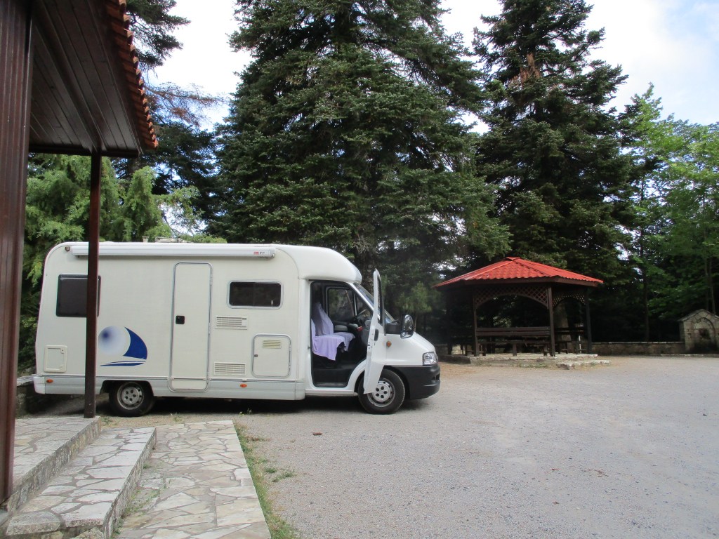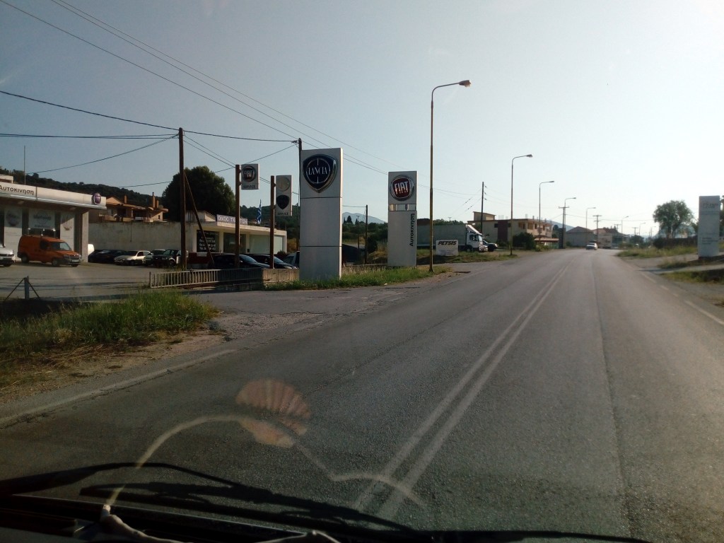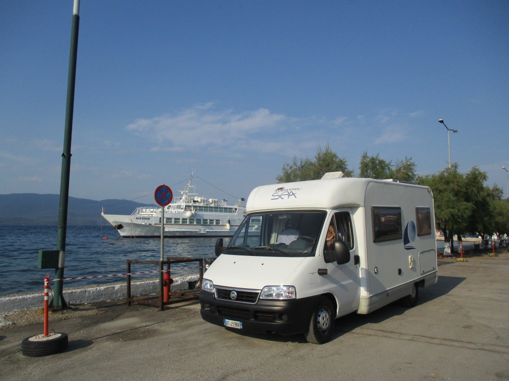 Subito dopo Trikala, invece del solito giro verso Larissa per beccare la A1 e scendere verso il golfo di Volos, troviamo le indicazioni per Lamìa e attraversiamo la Tessaglia occidentale sulla A3 nuova di zecca per un lungo tratto, e poi la bellissima N3 lungo le aspre pendici del monte Otrys. A Lamìa contiamo i primi 1000 km; da qui proseguiamo sulla statale costiera verso Stylida e Karavomilos, ma poi imbocchiamo di nuovo l’autostrada (A1) per non incasinarci nel traffico locale. Arriviamo allegramente a Glyfa verso le 18:00, ma l’ultimo battello era alle 17. Tanta gente in giro, troppa per i nostri gusti, il paese ha viuzze molto strette ed è complicato piazzare il camper. Senza battere ciglio, troviamo un piazzale nei pressi di una discoteca abbandonata all’ingresso del villaggio, e lì passiamo la notte, anche se Kira pare poco convinta di questa soluzione. La tappa, in tutto, è stata di quasi 400 km.