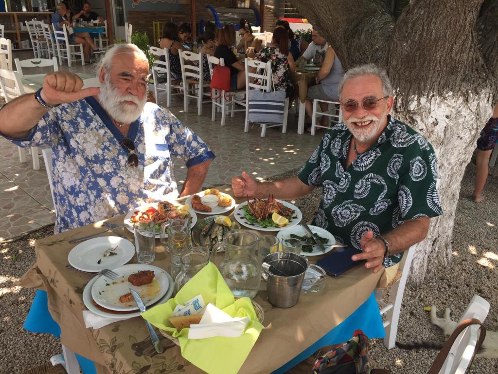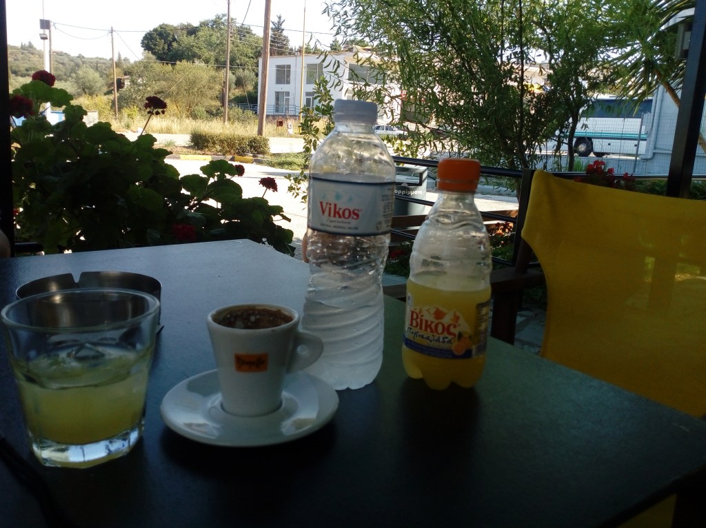 7 luglio, martedì. Alle 9, imbarco sul solito battello, ormai il Dinghy è come se andasse da solo. Appuntamento con Akis al molo di Agiokampos. Mattinata al bar in pieno stile ellenico. Come mi capita spesso di scrivere, pare che sei stato dappertutto e invece no, qui vicino c’è una spiaggetta dove fare un bagnetto prima di pranzo e poi festeggiare il mio compleanno in una profumatissima taverna dal nome epico di “Tsipouromachìa”, nel già toccato paesello di Neos Pyrgos. Da qui, seguendo come al solito il vecchio tracciato della statale Halkidas-Aedipsou, sempre più sconquassato, ci spostiamo verso le ben note cascate.