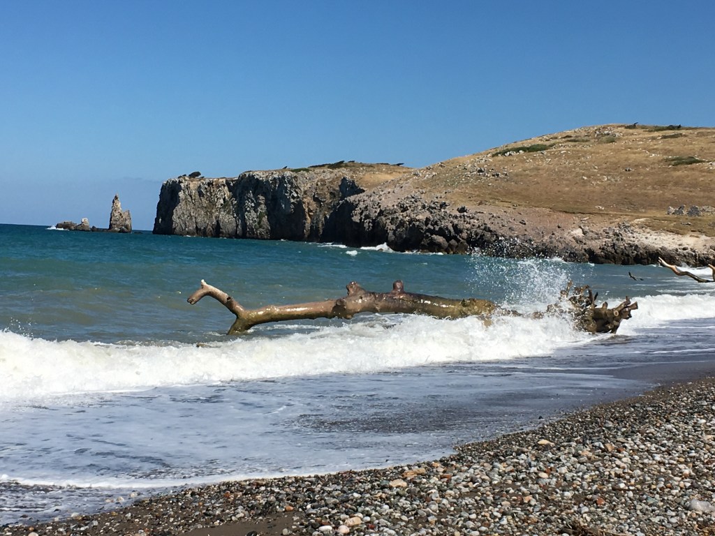 9 luglio, giovedì. Due notti e un giorno nella frescura e nel silenzio. Il posto è sempre bellissimo, un po’ più trasandato nel piazzale del parcheggio, dove evidentemente non prestano più la loro opera i volontari che avevamo visto all’opera nel 2019, e allora la parte dei pulitori la facciamo noi. Alle 9 partiamo e alle 10 siamo al solito forno di Giannis e nel giro di mezz’ora siamo in spiaggia, solito accampamento sulla duna che quest’anno è completamente deserta. C’è qualche cambiamento, una mareggiata ha deviato lo sbocco del fiume Voudoros e ha abbandonato sulla riva alberi monumentali. Mare mosso (come al solito), vento da nord (come al solito), fa quasi freddo.