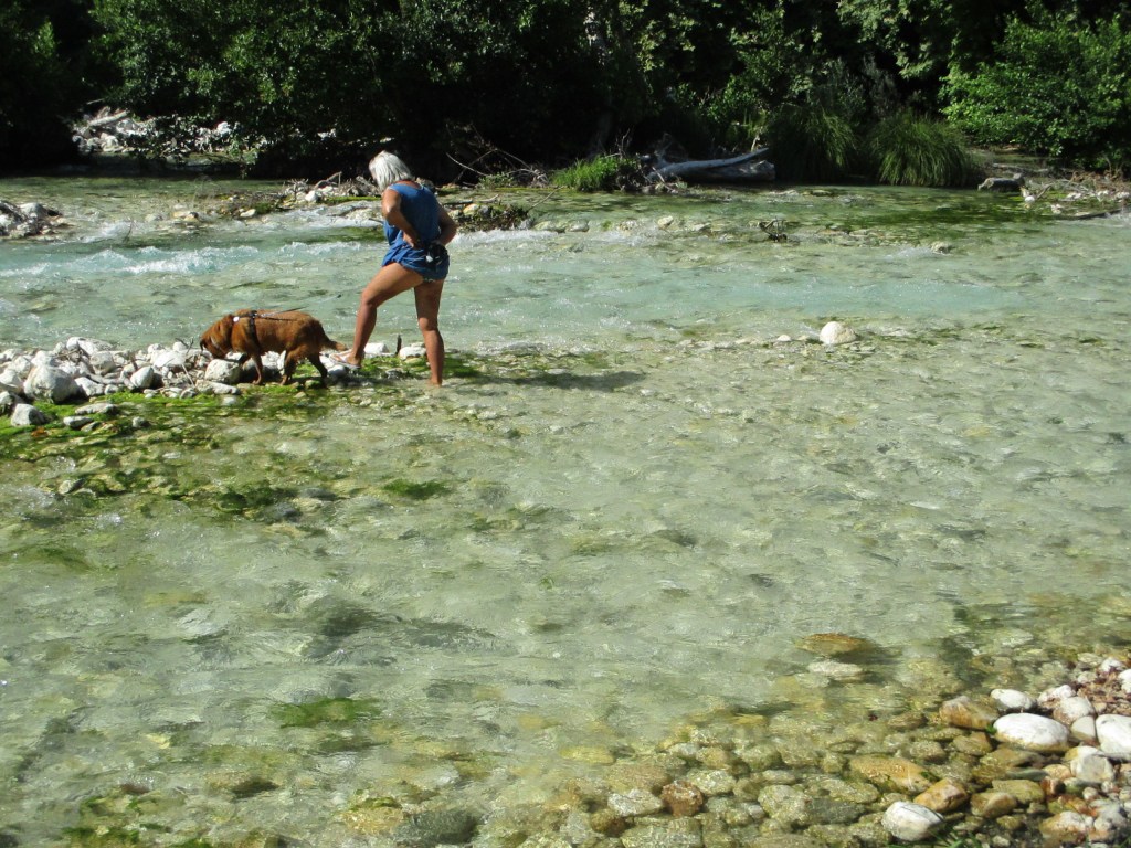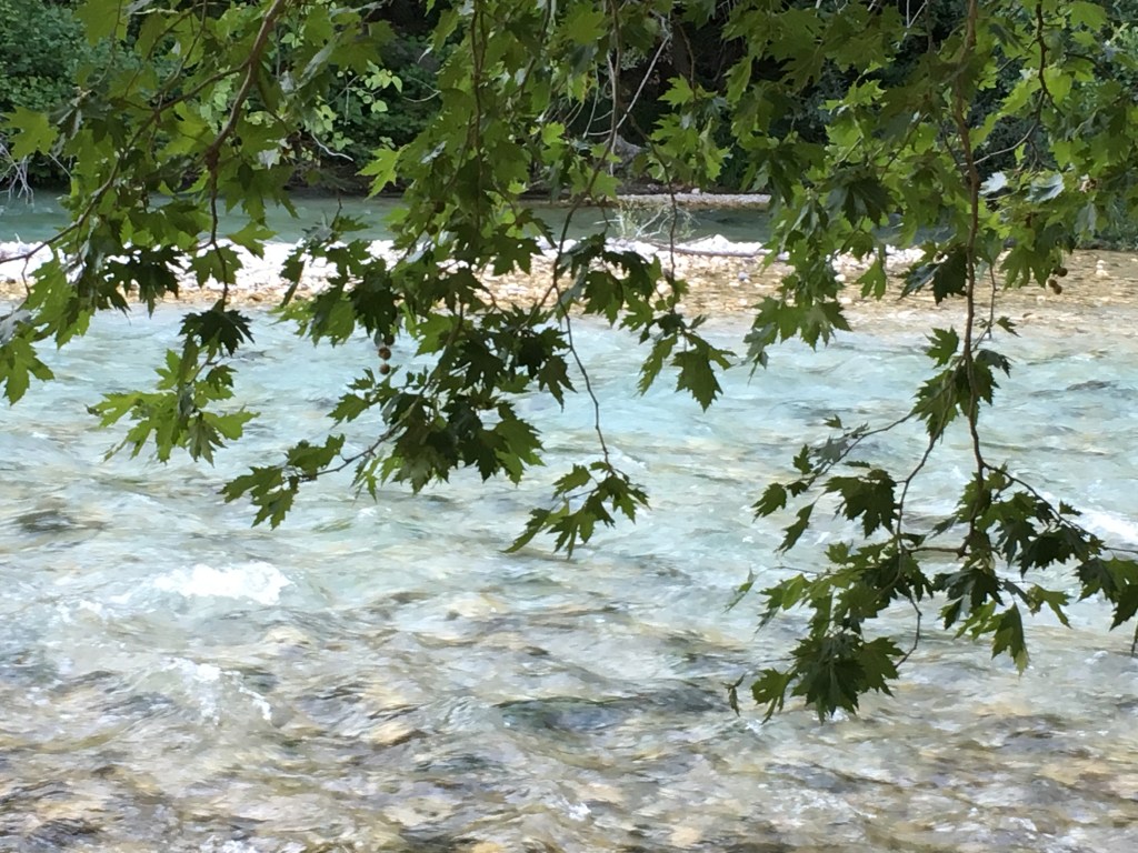 17 luglio, venerdì. Nelle ultime due giornate il vento è cambiato, e la temperatura si è abbassata, circa 20° al mattino. Record di permanenza a Diakoptò, dopo 5 notti togliamo l’accampamento dopo aver deciso di spezzare l’ultima tratta con un ritorno alle sorgenti dell’Acheronte. A8 poi A5 fino ad Amfilòhia, anzi un po’ prima sperando nel raccordo verso Prèveza, e invece ci tocca fare solito giro fino a Vònitsa, con sosta tattica alla solita isoletta. Solita statale fino a Mesopòtamos, solita provinciale fino a Glyki. Anche qui cambiamento: nel 2015 c’era un baretto abbandonato che adesso è una taverna ben gestita da persone molto gradevoli. Puciare i piedi nell’Acheronte dopo aver fatto anche oggi quasi 300 km piace moltissimo anche a Kira!