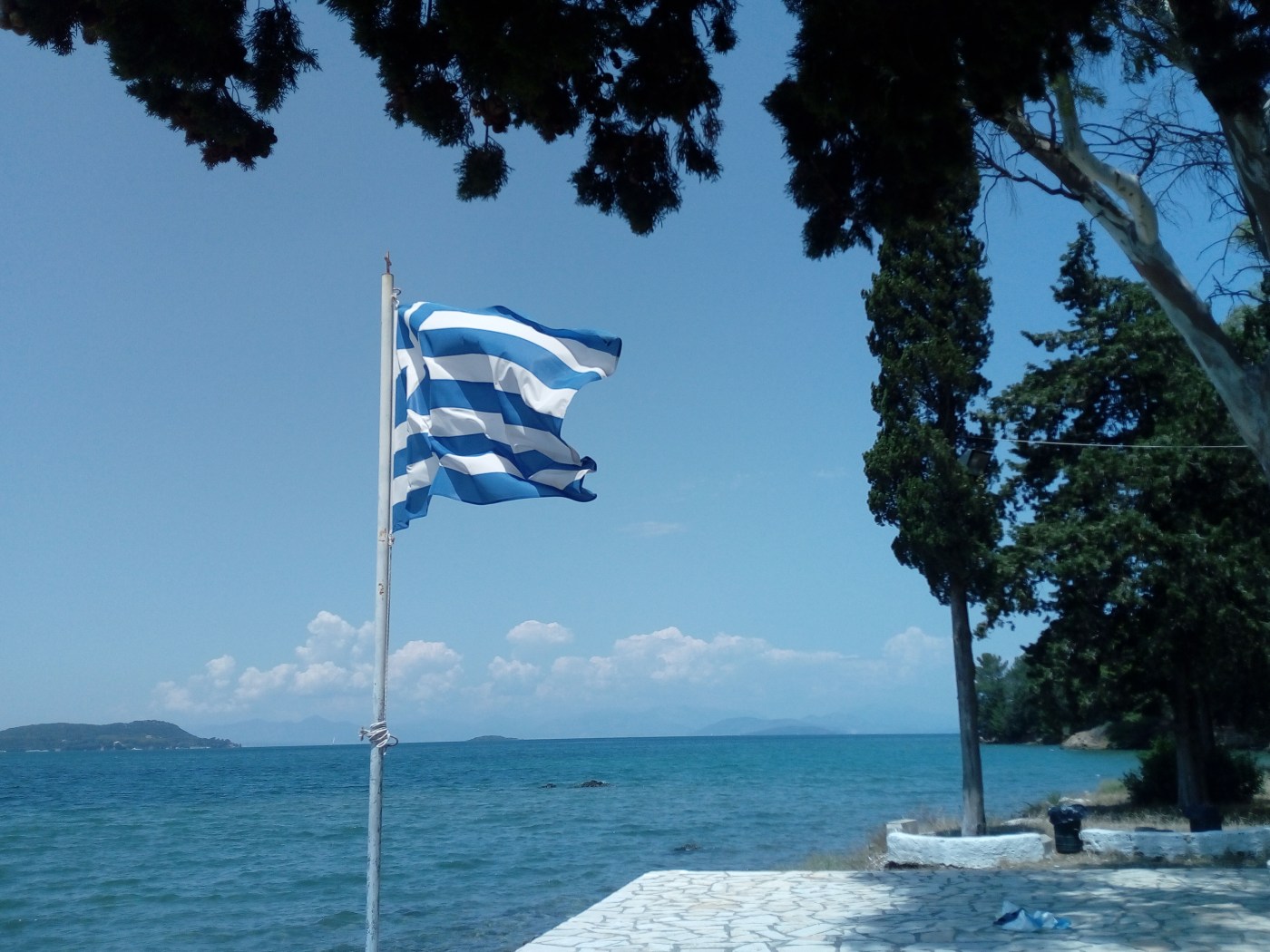 Torniamo a Sagiada in tempo per il pranzo, ma per la prima volta in 11 anni un tizio ci apostrofa in malo modo per mandarci via. Niente di che: già molti anni fa avevamo campeggiato in un’altra postazione qualche km indietro, anche questa provvista di doccia e cassonetto. In pieno sole, ma assolutamente deserta, se si escludono i bovini che due volte al giorno l’attraversano brucando. Erba fino alla riva, mare profondo e azzurro, una doccia spettacolare con acqua abbondante e freddissima come se sgorgasse direttamente dal sottosuolo. Dobbiamo ringraziare quell’unico greco malmustoso che ci ha “obbligato” a scoprire questo sito: la riva è quasi indenne dalla solita presenza di plastiche di ogni tipo, spiaggia di ciottoli come l’altra, ma appena entrati il fondo è morbido e pieno di vita. Bella anche la vista sul golfo, molto affascinante quando domenica ci raggiunge un temporale, che in pochi minuti passa e va.