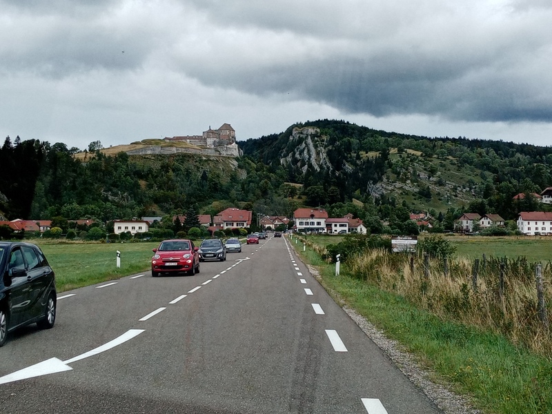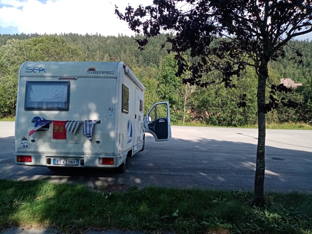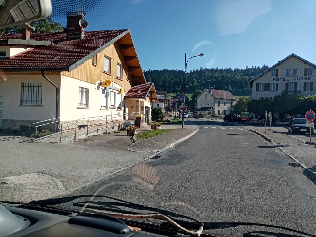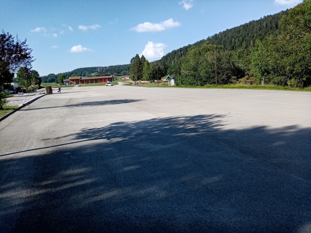 Più avanti, ci ritroviamo a fare un tratto di autostrada non a pedaggio intorno a Dijon. Sosta tattica per pranzo in un parcheggio sul lungofiume della Norges poco prima di entrare a Genlis; e ancora avanti, sulle belle strade di Francia, ed eccoci nel Giura e poi subito nel Doubs. Per non fare la stessa strada dell’anno scorso, a Dole cambiamo pista e passiamo sulla D673 verso Besançon. Ma è troppo presto per fare tappa in quella bellissima città ricca di storia e allora ancora avanti, sulla N57 verso Pontarlier e il confine svizzero. Questo è forse uno dei tratti di Francia che conosciamo meglio, curva dietro curva, salita dietro salita; e allora perché non fermarsi da queste parti per l’ultima notte? Detto fatto, per non girare troppo a vuoto, interrogo per la seconda volta in questo viaggio park4night, che ci guida nel grandissimo piazzale della scuola di sci di Les Hôpitaux-Vieux. Siamo sui 900 m di altitudine, e c’è più caldo qui che al livello del mare tre giorni fa, ma all’ombra si sta bene.