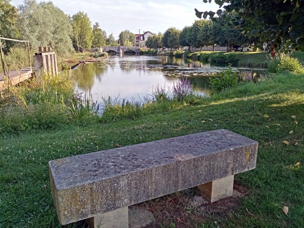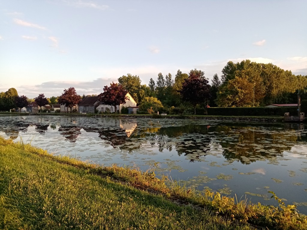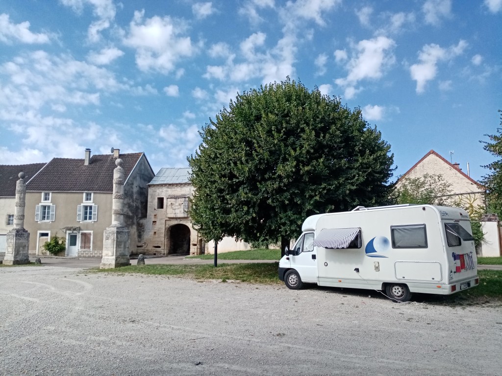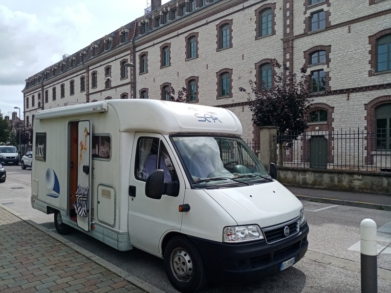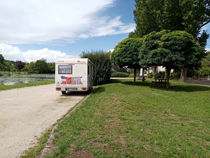 Non piove più. Una bella galoppata verso est, per un lunghissimo tratto sulla D2060 fino a Montargis, poi sulla D943 sfiorando Triguéres e Joigny fino a Saint Florentin, dove cominciamo a costeggiare il Canale di Borgogna seguendo la D905. Paesaggi che conosciamo bene, e che restano incantevoli. Superiamo Ancy-le-Franc, che era stata una delle nostre tappe in un viaggio precedente, e giunti ormai a cinque ore ininterrotte di viaggio proviamo ad esplorare il paese successivo, Nuits. Nei pressi di una chiusa sull’Armançon, subito fuori da una porta monumentale che lascia supporre un glorioso passato, troviamo un vasto parcheggio in parte sterrato, ombreggiato da grandi tigli, dotato di acqua corrente e servizi igienici, e perfino di attacchi alla corrente elettrica. Appena arrivati ci fermiamo vicino a un prato sulla sponda del laghetto formato dalla diga, dove ragazzini giocano nell’acqua; aiuole fiorite e panchine, decoro e grande pulizia. In fondo, un antico ponte a tre arcate. Una coppia di anziani si ferma a fare due chiacchiere, altri passanti salutano cordialmente. Il parcheggio, ça va sans dire, è gratuito. Mentre scende la sera, cambiamo posizione avvicinandoci alle prese. Non potevamo chiedere di meglio.