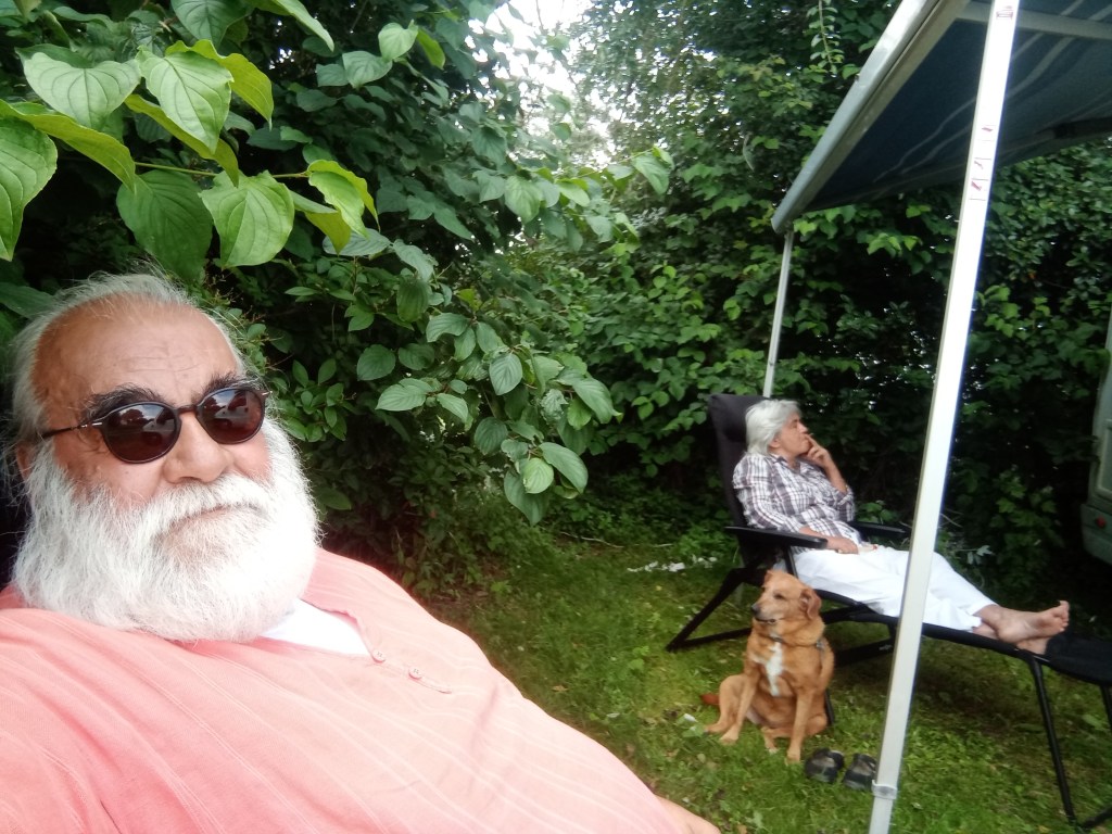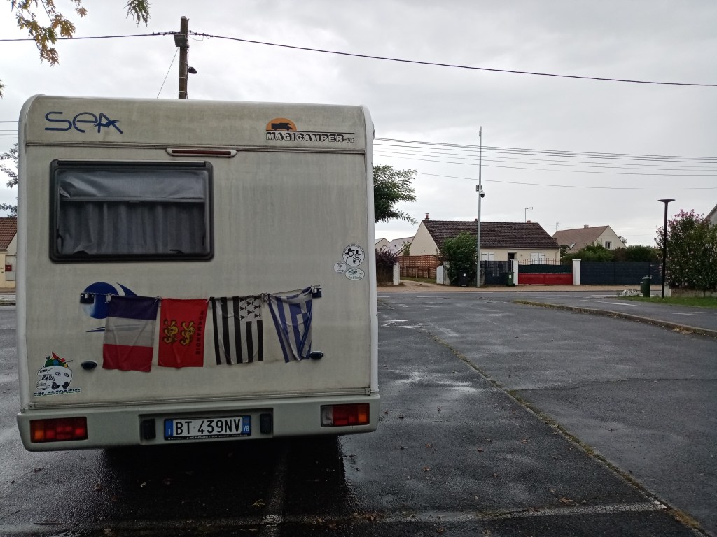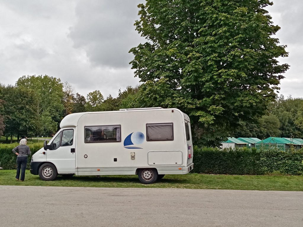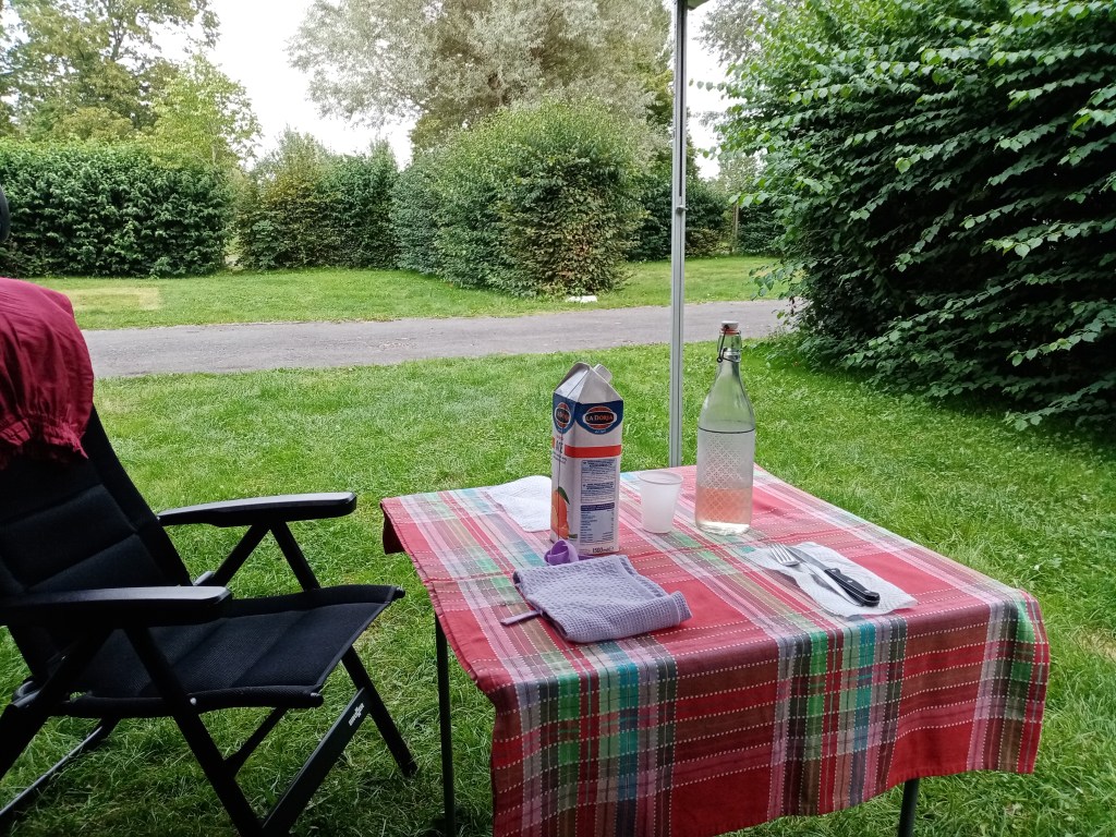 E infatti, seguendo una pista ormai ben nota, dopo una sosta tattica per gasolio al Leclerc di Saint-Hilaire-du-Harcouet, e un’altra sosta tattica per spesa al Carrefour di Alençon, Mirella suggerisce di evitare di far la fine dello scorso anno cercando inutilmente spazi o piazzole e senza perdere tempo ficcarci in un campeggio municipale. Detto fatto, lo troviamo dopo una ventina di km, a Beaumont-sur-Sarthe. Sono quasi le sei. Il campeggio è veramente bello, a bordo fiume, ampi viali e belle piazzole, uno spettacolare blocco servizi dotato addirittura di una sala comune con tv e biblioteca; e vale la sosta anche per il prezzo, solo 18 euro. Manco a farlo apposta, appena parcheggiato attacca a piovere. Ma i camperisti edonisti non si scompongono, e dopo una ricca doccia sono pronti a fare cena all’aperto, sotto il tendalino.