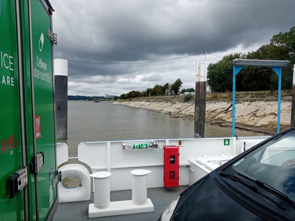 MERCOLEDÌ 9 AGOSTO. Fatta l’ultima doccia, partiamo verso le nove, dopo aver fatto scorta alla locale piccola boulangerie. Oggi ci aspetta un altro tappone, più di 300 km, perché ci sposteremo verso il Cotentin. Ieri avevamo scoperto che è possibile attraversare la Senna in traghetto, evitando così l’autostrada, ed è quello che faremo. Seguiamo dunque la D295 superando Fècamp, e a Goderville prendiamo la direzione verso Port-Jerome, attraversando centri grandi e piccoli nell’interno. Si avvicina l’ora di pranzo, e la strada costeggia un grandissimo parco in cui troneggia uno splendido edificio: l’Abbaye du Valasse, che subito scegliamo come luogo di tappa per il pranzo. Parcheggio gratuito con stalli dedicati ai camper, visita libera del parco. Da lì, seguendo la D173, raggiungiamo la Cale du Bac de Port-Jerome, dove ci imbarchiamo su un battello che in pochi minuti ci porta sull’altra riva, a Quillebeuf-sur-Seine.