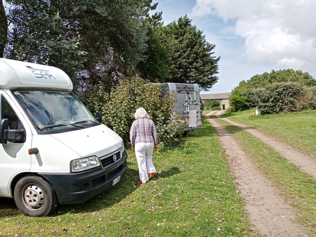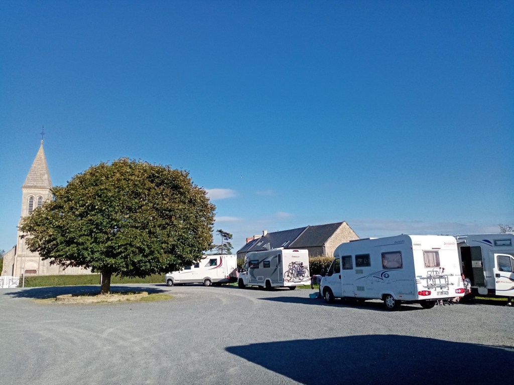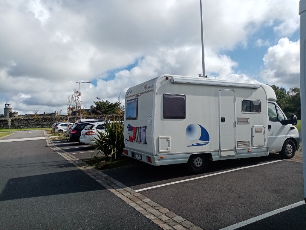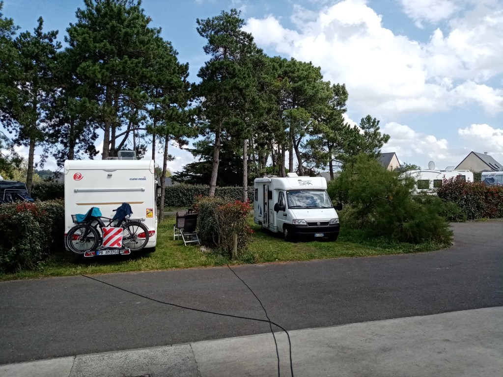 La nostra meta è la Route des Falaises, che offre una spettacolare vista sulla baia di Mont-Saint-Michel; poi vedremo dove piazzarci per l’ultimo notte all mare della Normandia. A Bréhal ci immettiamo sulla D971. Da qui in avanti il percorso si snoda nell’interno attraverso dipartimentali grandi e piccole, grandi distese di campi coltivati inframmezzate a piccoli villaggi. Superata Carolles, la strada torna larga e in breve si comincia a vedere di nuovo il mare. C’è una piazzola, accostiamo giusto il tempo di fare una foto perché c’è un magnifico divieto di sosta ai camper, ma notiamo che ai piedi della scogliera c’è un gruppo di costruzioni che somiglia a un campeggio. Ed infatti è così, anzi meglio: in pochi minuti raggiungiamo un incrocio in mezzo al paesino di Saint-Jean-le-Thomas, dove spicca il classico cartello che segnala l’area camper. Non ci illudiamo di trovare posto, tra ieri e oggi abbiamo incrociato centinaia di camper, ma tentar non nuoce e stavolta la fortuna ci assiste: un posto c’è, l’ultimo, e per fortuna non è sull’asfalto ma sullo sterrato. Nonostante l’affollamento, il posto è calmissimo. Non sono ancora le quattro, abbiamo fatto poco più di 30 km ma non vediamo l’ora di spaparanzarci sotto l’ombra dei pini. Senza elettricità, perché le 4 prese sono già occupate, 10 euro per 24 ore. A 300 metri dal mare, che si intravede dietro la capanna dei servizi. Ottima sistemazione, per la nostra ultima notte in Cotentin.