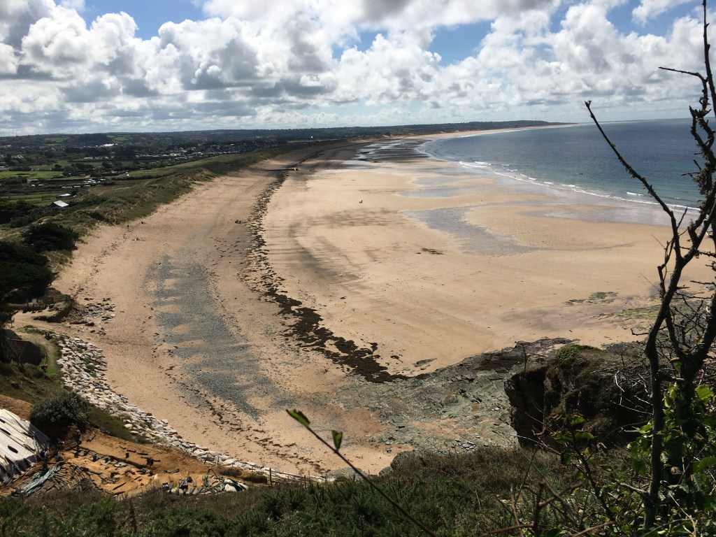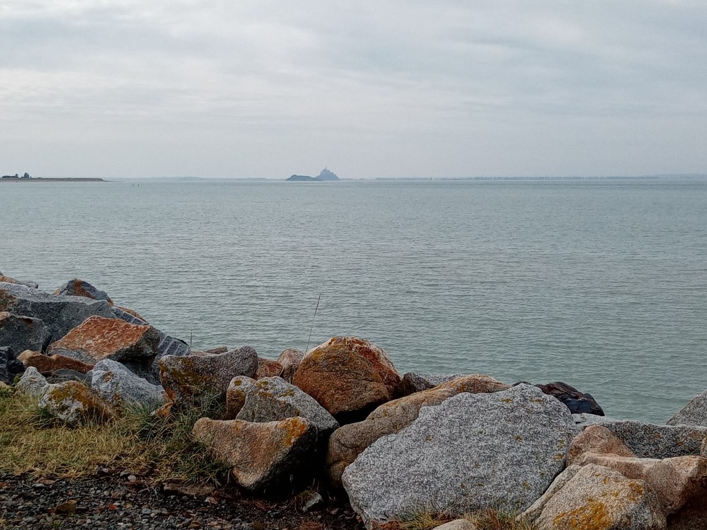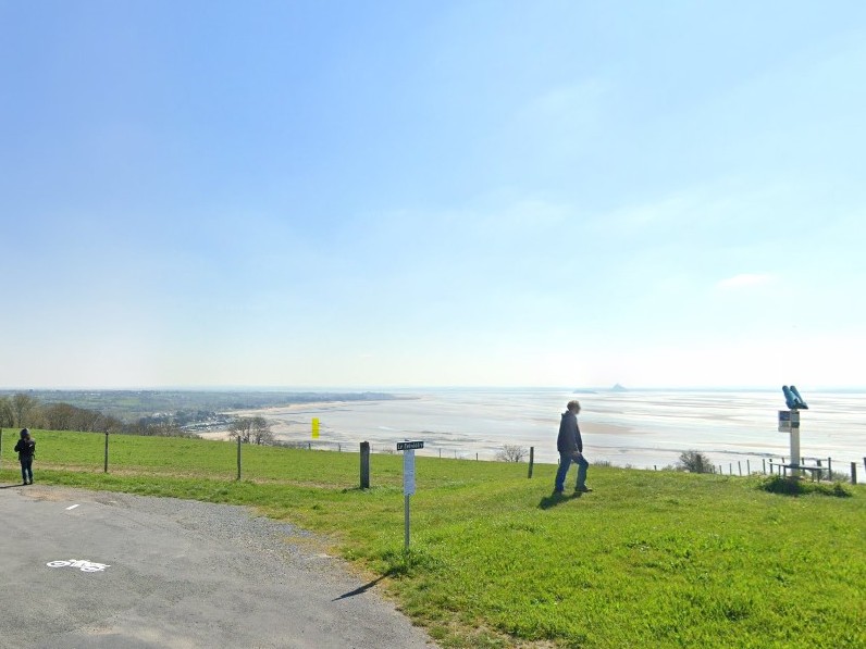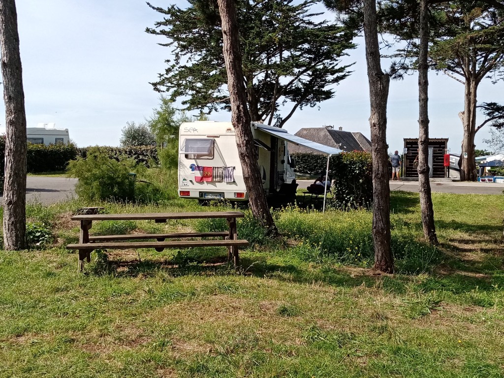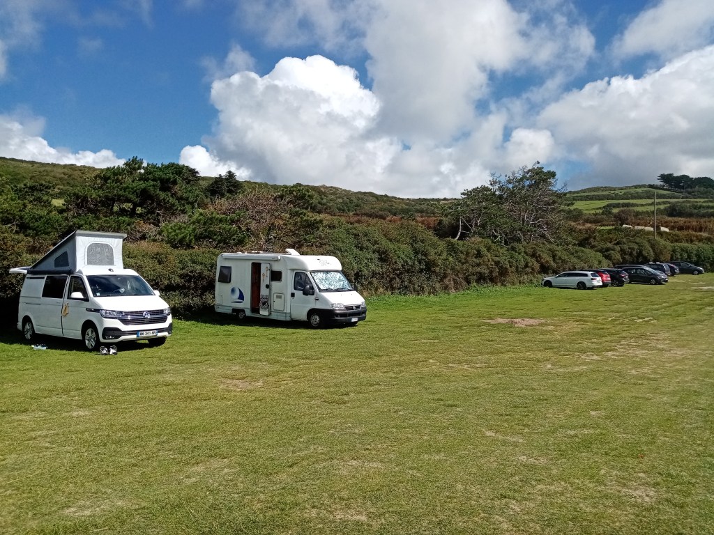 La nostra meta è la Route des Falaises, che offre una spettacolare vista sulla baia di Mont-Saint-Michel; poi vedremo dove piazzarci per l’ultimo notte all mare della Normandia. A Bréhal ci immettiamo sulla D971. Da qui in avanti il percorso si snoda nell’interno attraverso dipartimentali grandi e piccole, grandi distese di campi coltivati inframmezzate a piccoli villaggi. Superata Carolles, la strada torna larga e in breve si comincia a vedere di nuovo il mare. C’è una piazzola, accostiamo giusto il tempo di fare una foto perché c’è un magnifico divieto di sosta ai camper, ma notiamo che ai piedi della scogliera c’è un gruppo di costruzioni che somiglia a un campeggio. Ed infatti è così, anzi meglio: in pochi minuti raggiungiamo un incrocio in mezzo al paesino di Saint-Jean-le-Thomas, dove spicca il classico cartello che segnala l’area camper. Non ci illudiamo di trovare posto, tra ieri e oggi abbiamo incrociato centinaia di camper, ma tentar non nuoce e stavolta la fortuna ci assiste: un posto c’è, l’ultimo, e per fortuna non è sull’asfalto ma sullo sterrato. Nonostante l’affollamento, il posto è calmissimo. Non sono ancora le quattro, abbiamo fatto poco più di 30 km ma non vediamo l’ora di spaparanzarci sotto l’ombra dei pini. Senza elettricità, perché le 4 prese sono già occupate, 10 euro per 24 ore. A 300 metri dal mare, che si intravede dietro la capanna dei servizi. Ottima sistemazione, per la nostra ultima notte in Cotentin.