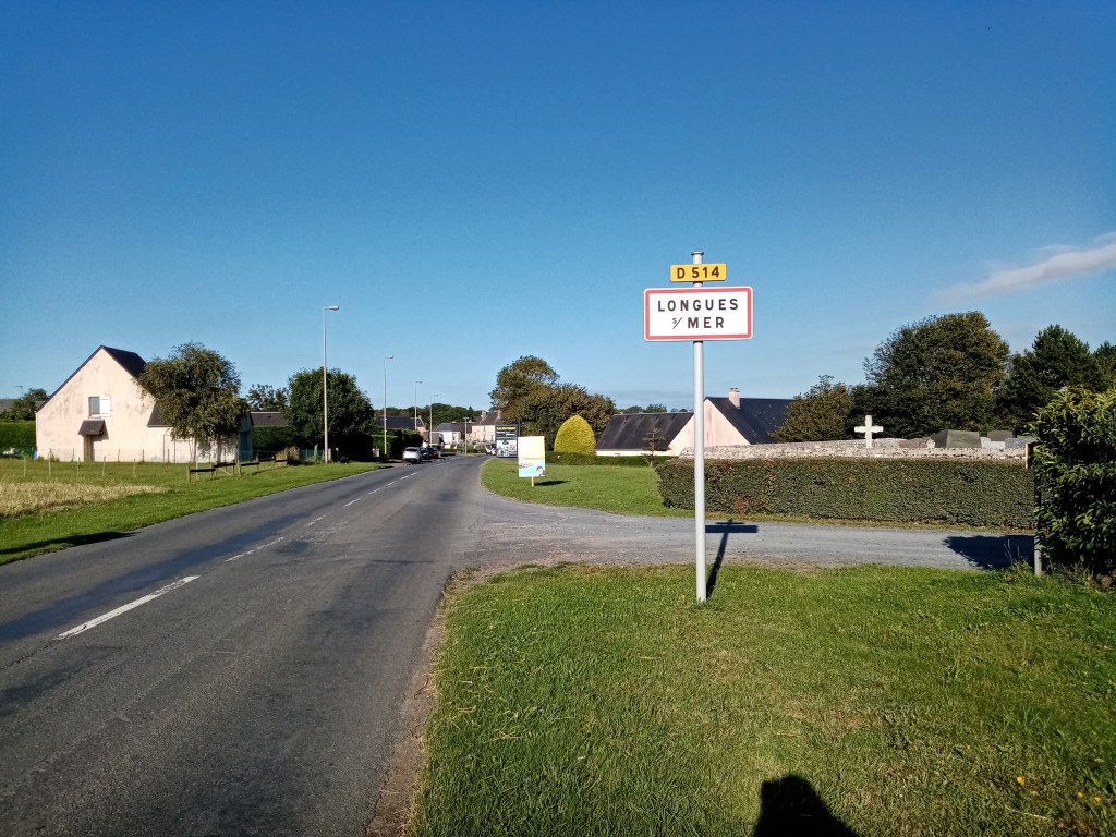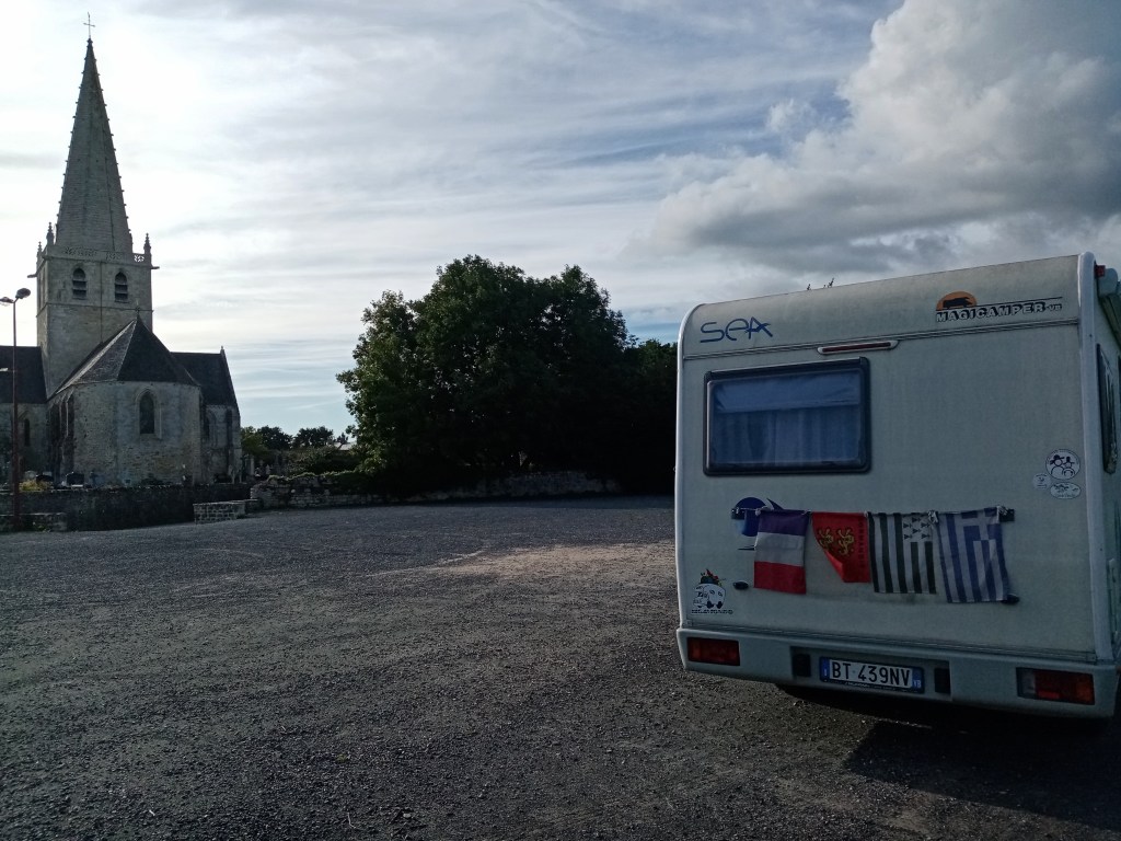 Da qui, ci spostiamo verso Beuzeville per prendere la A13, che lasciamo a Caen, diretti verso il mare, che costeggiamo seguendo la ben nota D514. Superiamo Courselles-sur-Mer e Arromanches, e ci rendiamo conto che in questo settore, che è poi quello delle spiagge dello sbarco, aree e parcheggi sono molto affollati e la dipartimentale molto trafficata. Così decidiamo di deviare verso l’interno per raggiungere la la più scorrevole N13. Visto che abbiamo già fatto 250 km, all’altezza di Longues-sur-Mer, decidiamo di fermarci e di approfittare per visitare un sito che nei vari viaggi in Normandia non avevamo ancora toccato. Ma è ormai troppo tardi, l’Abbazia è già chiusa e così ci piazziamo per la notte nell’ampio spiazzo antistante la chiesa, nel Cotentin ci andremo domani. Posto molto tranquillo, all’arrivo siamo in sei camper ma prima di notte vanno via tutti e restiamo soli.