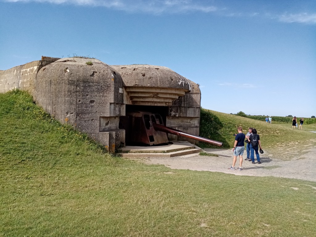 GIOVEDÌ 10 AGOSTO. Anche la notte è stata molto tranquilla. Svegliati dai rintocchi del campanile, due volte tre suoni brevi e poi una lunga scampanata, sembra quasi un saluto all’alba. Cercato pane e croissant, ma l’unico negozio è irrimediabilmente chiuso. Facciamo il punto, e decidiamo di approfittare per fare una passeggiata a piedi tra prati e pascoli verso il sito della Batteria di Longues-sur-Mer, che è a meno di due km. Il sito vale il viaggio: è ben curato, servito da parcheggi molto capienti con aree dedicate a bus e camper, una sezione dell’Ufficio del Turismo dipartimentale con un piccolo museo-boutique, servizi igienici, panchine, aiuole fiorite, area picnic. Dal parcheggio, una bella passeggiata in mezzo ai campi coltivati a grano raggiunge la scogliera a picco sul mare in un punto panoramico da cui si vedono in lontananza i resti del Porto artificiale di Arromanches. La batteria, una delle poche del Vallo Atlantico dove si possono vedere ancora i cannoni originali, era composta da diversi bunker collegati tra loro mediante cunicoli. A visita finita, Mirella decide che andrà a prendere il camper e mangeremo qui, così dopo pranzo faremo ancora un po’ di passeggiata verso il mare.