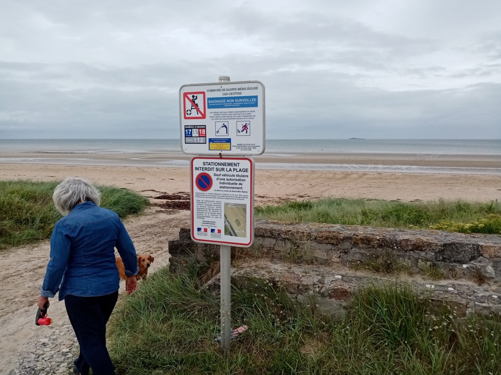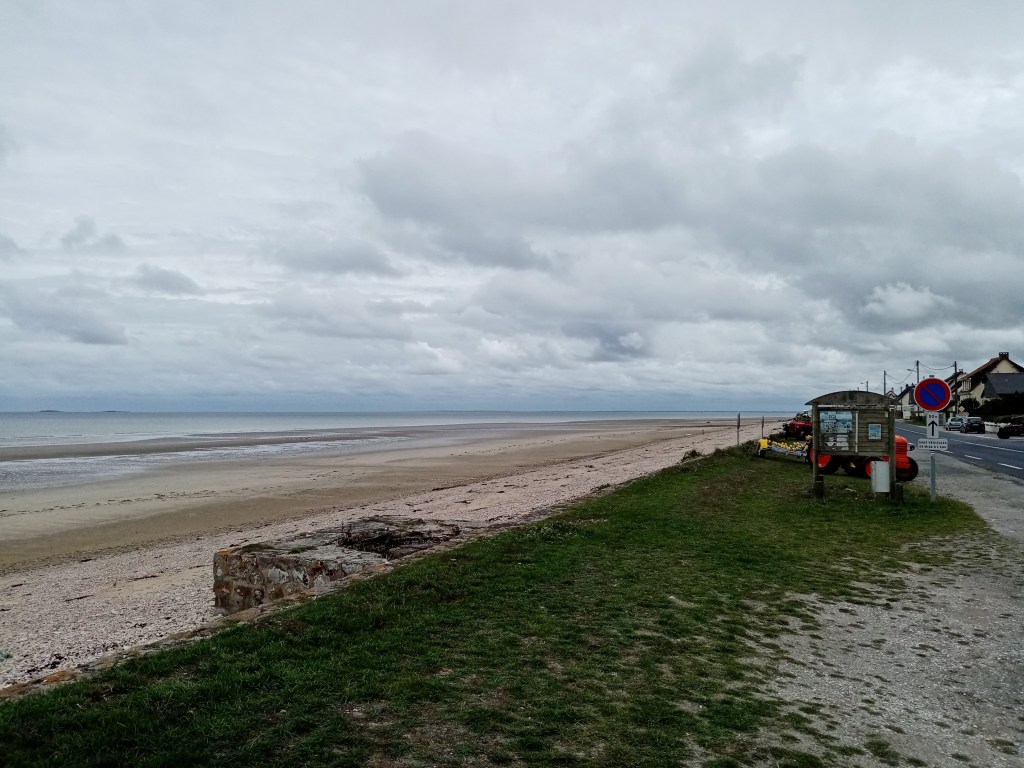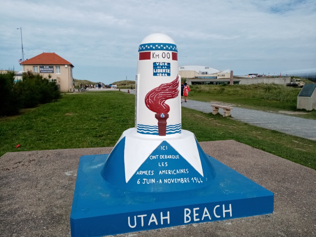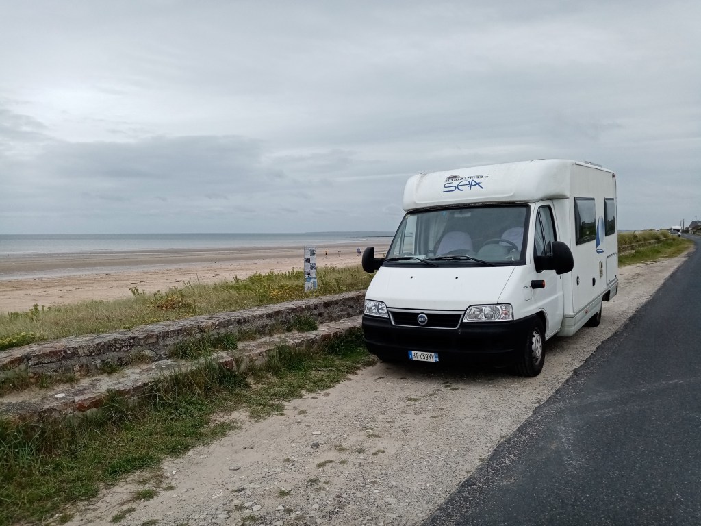 Alle quattro si parte. Dobbiamo fare un po’ di scorta cibarie, così lasciamo perdere l’idea di andare sula N13 e proseguiamo sulla D514. Superiamo le tante località legate alla memoria del D-Day (Colleville, Saint-Laurent, Vierville, Saint-Pierre-du-Mont, luoghi già visitati in molteplici occasioni) e dopo una breve sosta al Carrefour di Grandcamp-Masy – altro posto che sicuramente vale il viaggio ma sarà per la prossima volta – andiamo a imboccare la N13 a Osmanville. Usciamo a Saint-Côme-du-Mont verso la D913, superiamo Sainte-Marie-du-Mont e verso le sette siamo sistemati nel bel parcheggio gratuito nei pressi del Museo Memoriale di Utah Beach (La Madaleine Plage). Tempo bello, ne approfittiamo per fare due passi sulla spiaggia.