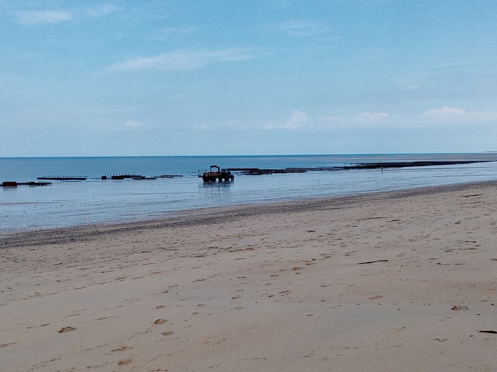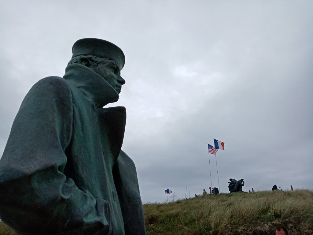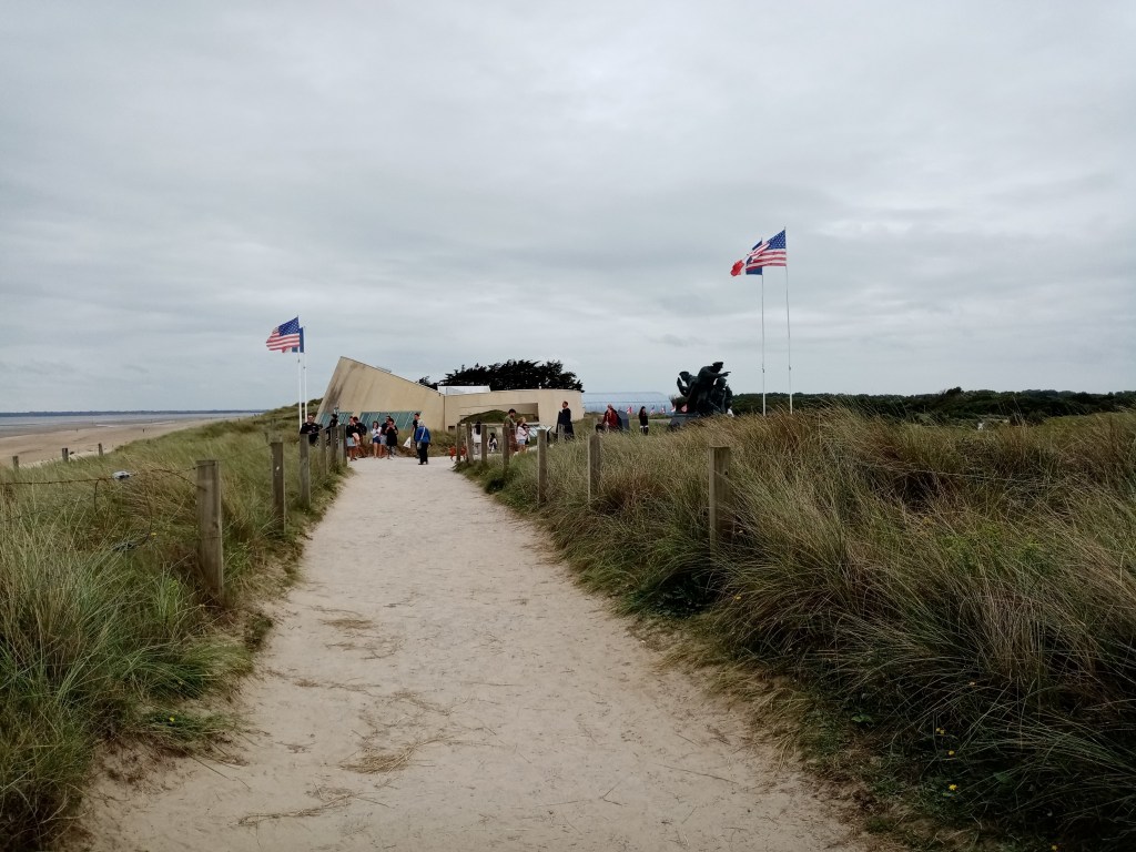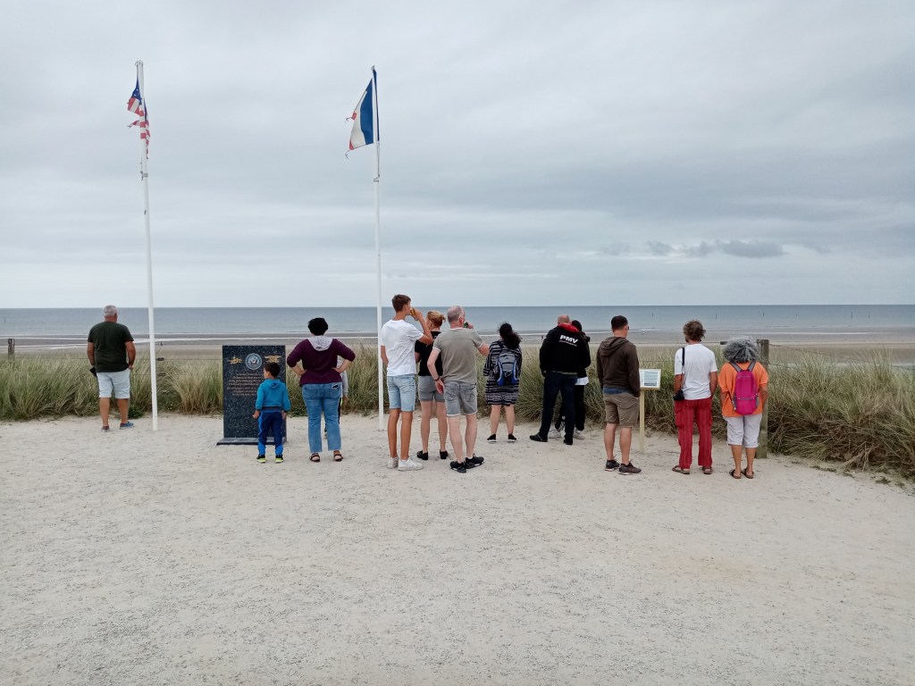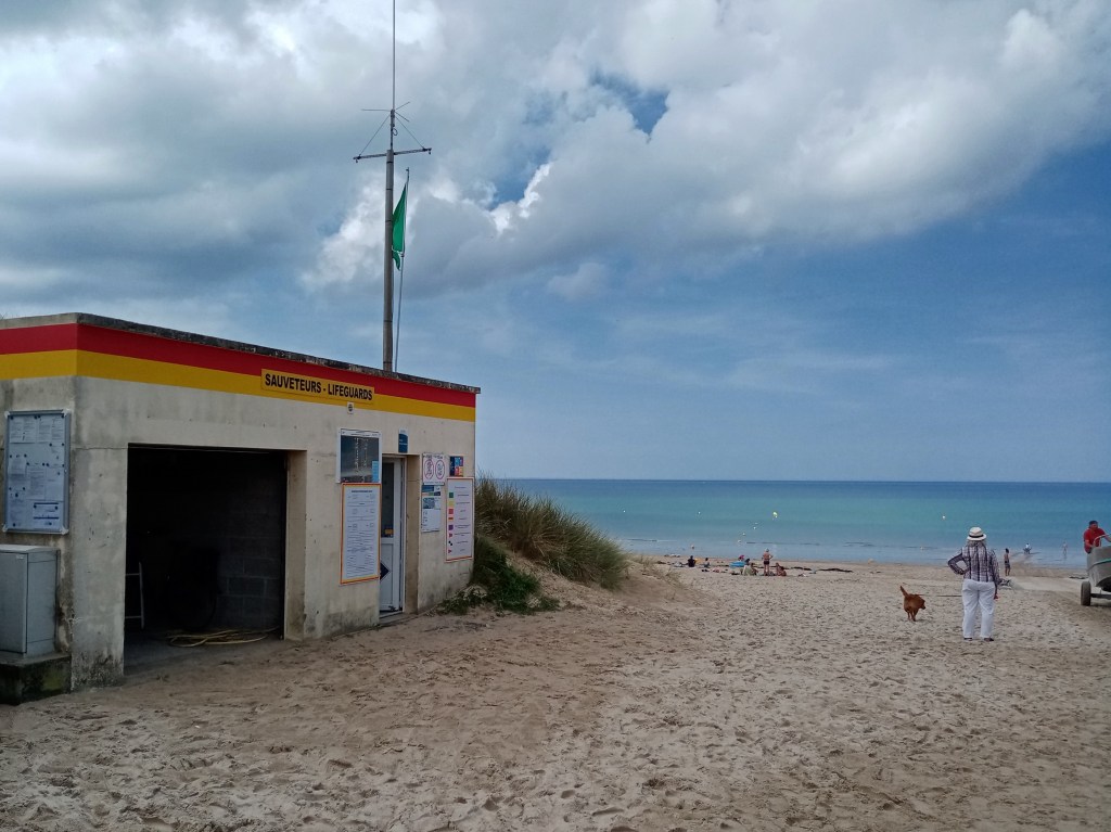 Alle quattro si parte. Dobbiamo fare un po’ di scorta cibarie, così lasciamo perdere l’idea di andare sula N13 e proseguiamo sulla D514. Superiamo le tante località legate alla memoria del D-Day (Colleville, Saint-Laurent, Vierville, Saint-Pierre-du-Mont, luoghi già visitati in molteplici occasioni) e dopo una breve sosta al Carrefour di Grandcamp-Masy – altro posto che sicuramente vale il viaggio ma sarà per la prossima volta – andiamo a imboccare la N13 a Osmanville. Usciamo a Saint-Côme-du-Mont verso la D913, superiamo Sainte-Marie-du-Mont e verso le sette siamo sistemati nel bel parcheggio gratuito nei pressi del Museo Memoriale di Utah Beach (La Madaleine Plage). Tempo bello, ne approfittiamo per fare due passi sulla spiaggia.