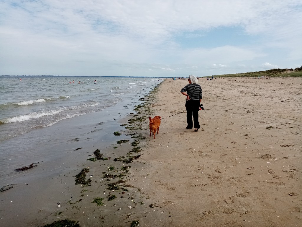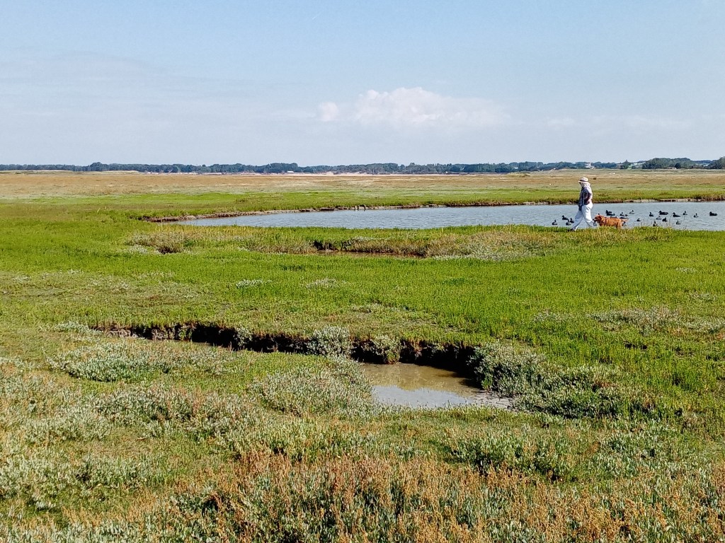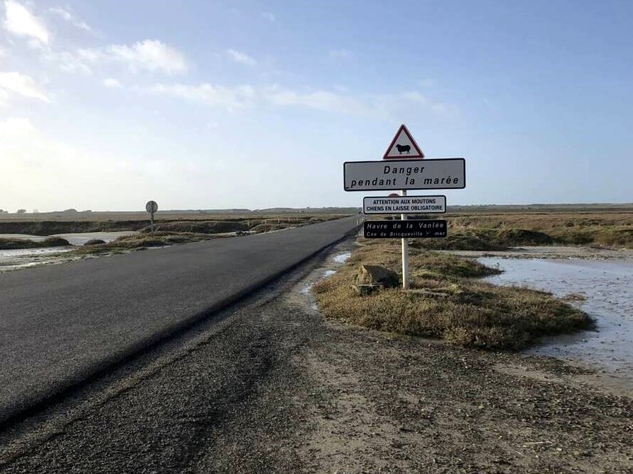 GIOVEDÌ 17 AGOSTO. Veniamo svegliati dal picchiettare della pioggia sul tetto. Con molta calma facciamo le operazioni di carico e scarico e lasciamo questo bel posto tranquillo in mezzo ai campi. D650 in direzione sud fino al rondò di Heugueville-sur-Sienne, dove imbocchiamo la D20. Bella strada scorrevole, che per un lungo tratto offre lo spettacolo di un grande estuario che viaggia parallelo al mare, che a tratti abbiamo intravisto tra le fitte siepi che costeggiano l’asfalto. A Briqueville-sur-Mer svoltiamo verso il mare, e dopo una stretta gimcana tra le case il panorama si apre sull’Estuario della Vanlée, attraversato da un lungo rettilineo praticamente a filo di palude. Non per niente, all’inizio di questo km, i cartelli segnalano il pericolo di inondazioni dovute alla marea, e la presenza di montoni liberi al pascolo. Troviamo posto in un parcheggio (gratuito) molto affollato, nei pressi della calata a mare dei trattori dei coltivatori di molluschi, che taglia l’alta duna dando accesso a una spiaggia (libera) che si estende a perdita d’occhio. Il tempo si è messo decisamente al bello, anzi c’è proprio caldo. Dopo pranzo, passeggiata verso le saline, altro punto notevole di questo sito, che lasciamo verso le tre, diretti a sud.