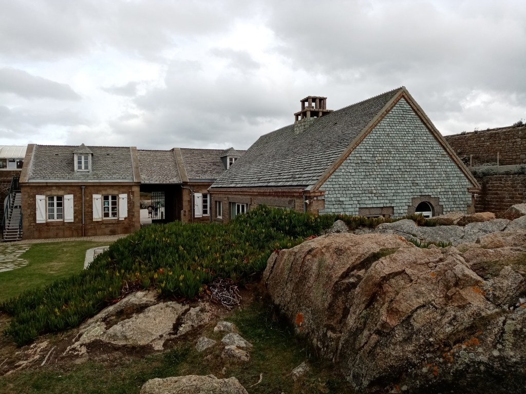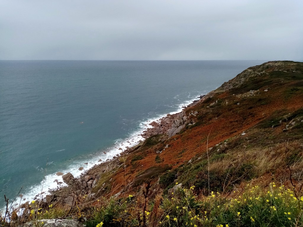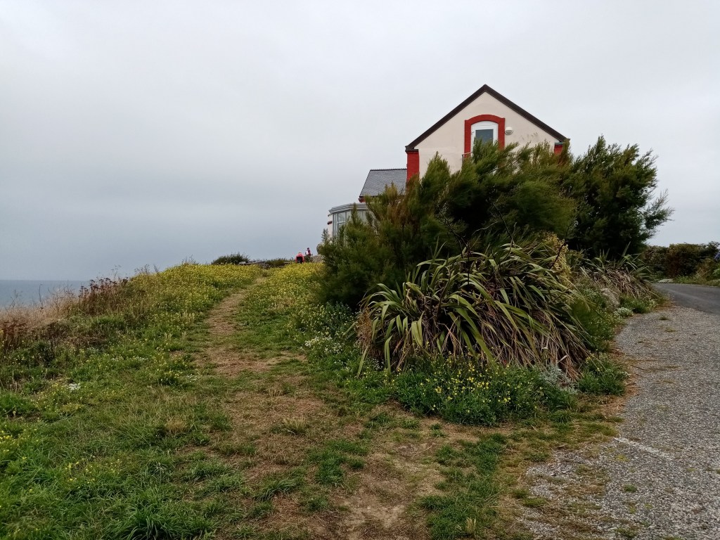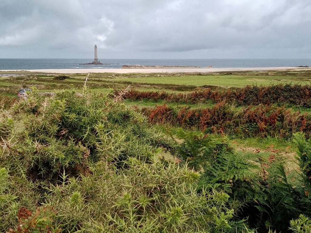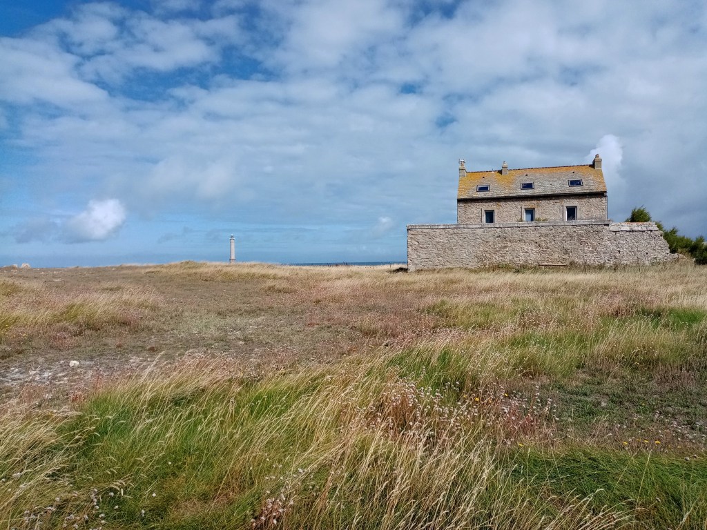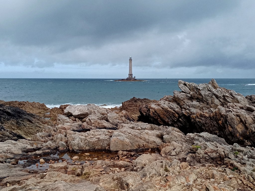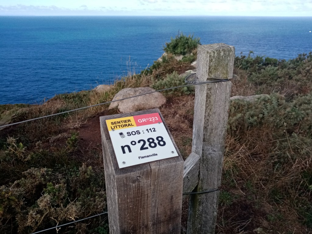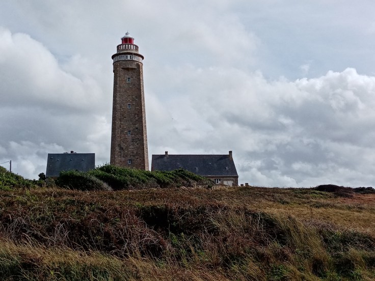 Un’altra verifica alla mappa, e si prosegue, passando alti sul panorama delle Dunes de Biville, beccando poi la D64 a Vasteville, attraversando Clairefontaine e Siouville, sfiorando il porto di Dielette, dove prendiamo la D4. Appena entrati in Flamanville, sosta tattica per viveri in previsione della chiusura di Ferragosto; poi seguiamo le indicazioni per il parcheggio (gratuito) del castello. Che è chiuso; e niente, che ci stiamo a fare stanotte in questo peraltro bellissimo parcheggio quando c’è qui il mare a meno di 1 km? Si va e si vede. E si resta, nei pressi di un vecchio faro trasformato in ristorante con alloggio, in cima a una spettacolare scogliera ricoperta di erica con vista sul Cap de Flamanville, mentre il tempo si rimette al brutto.