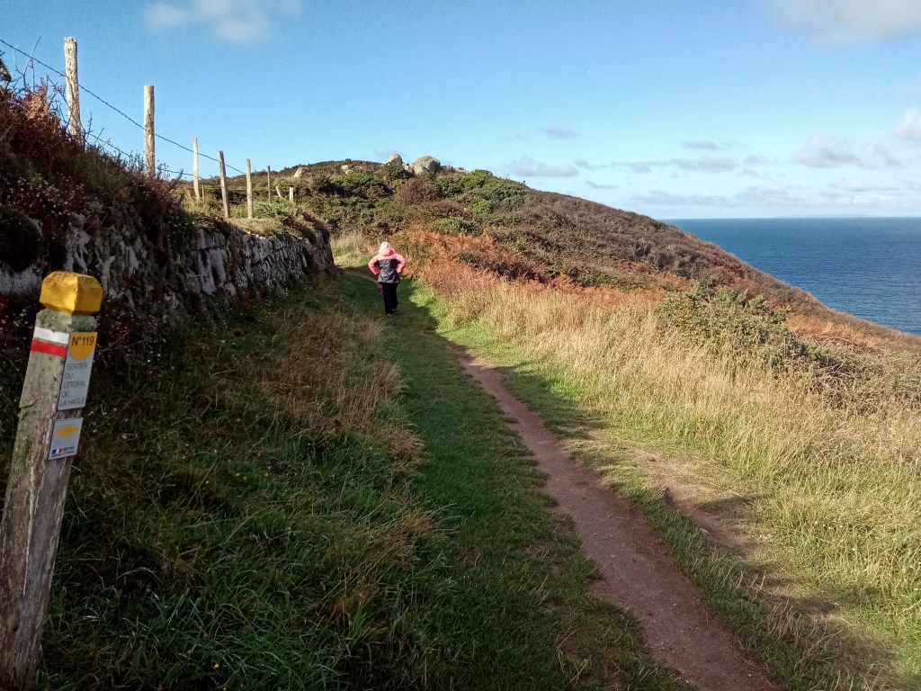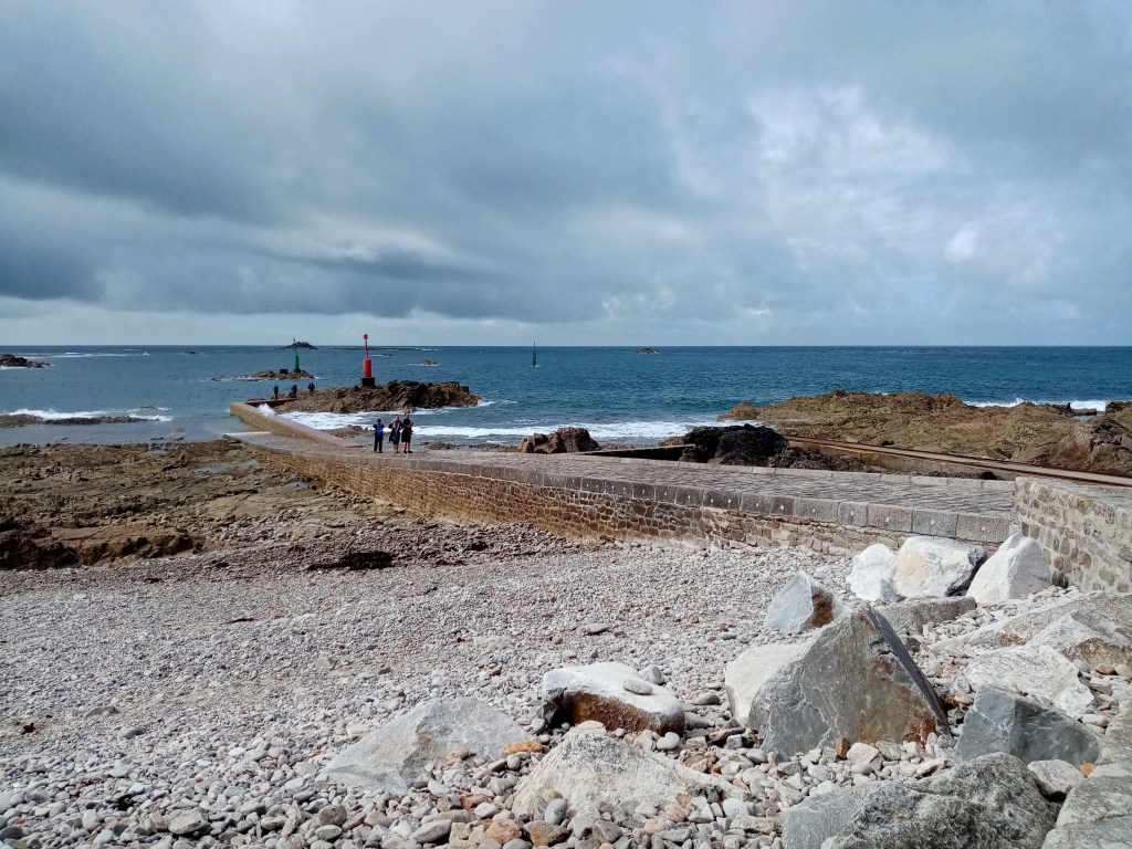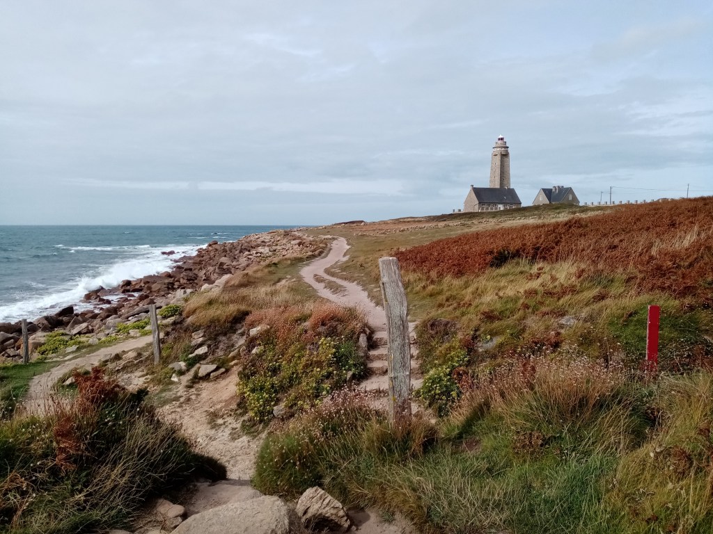 DOMENICA 13 AGOSTO. E chi si muoverebbe da questo paradiso, dove l’unico suono è la canzone del mare! È stato faticoso arrivare fin qui, ma la situazione è davvero impagabile. Dal finestrino osservo due conigli selvatici che si rincorrono tra i bassi cespugli e i cumuli di sassi di granito rosa, forse macerie del vecchio faro. Stanotte deve aver piovuto. C’è calma di vento, ma l’aria è frizzantina. Ma il viaggio è viaggio, e lasciamo Cap Lévi verso le otto e mezza. Obiettivo, la penisola della Hague, il capo opposto a questo, alla cui estremità occidentale c’è Cap de Goury. Facendo a ritroso l’ultima parte del percorso di ieri, raggiungiamo la D116 nei pressi di Fermanville, e la seguiamo in direzione ovest attraversando i bellissimi viali di una Cherbourg deserta (D901), per poi imboccare alla fine dell’abitato la costiera D45, che è in pratica una sequenza di saliscendi e curve che a tratti si scosta dal mare, con strettoie quando si incontrano i minuscoli innumerevoli centri abitati. Subito dopo Omonville-la-Rogue la strada fa una svolta decisa a sinistra, e sulla destra vediamo al volo un cartello che indica il Camping du Hable. Stop, dietrofront e breve sosta per chiedere se c’è posto. C’è, fissiamo la piazzola, paghiamo e proseguiamo per la nostra meta, a cui mancano circa 10 km. Verso le dieci Raggiungiamo Auderville, ritroviamo la D901, e dopo pochi minuti troviamo l’indicazione di sistemare il camper in un parcheggio (gratuito), perché l’ultimo km prima di Goury si può fare solo a piedi, esclusi residenti e autorizzati. Il parcheggio è abbastanza affollato ma comodo, la camminata a piedi è gradevolissima e offre una vista mozzafiato.