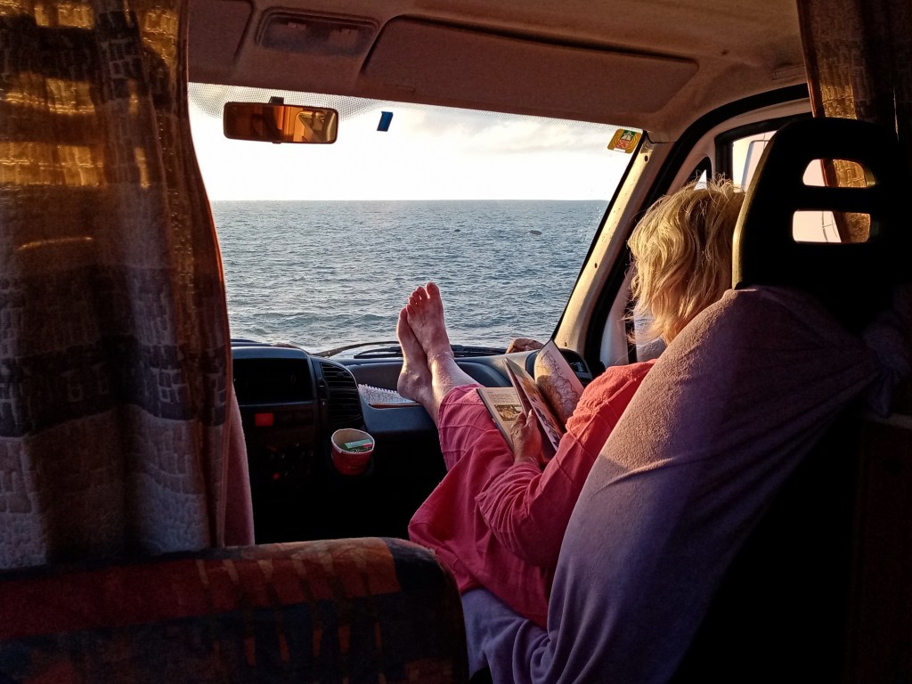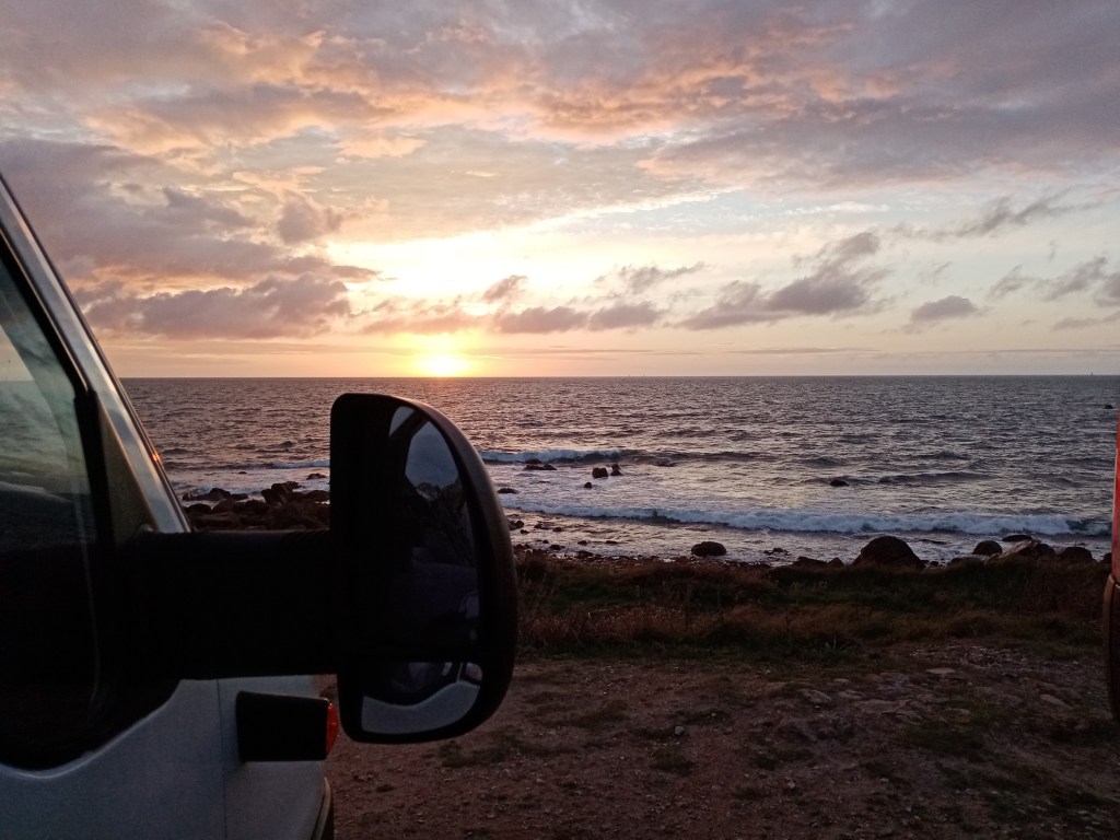 Verso le otto ritorniamo a baita. Nel parcheggio quasi deserto il Dinghy è sistemato in favore di tramonto, e dopo aver cenato ci godiamo questa vista attendendo la notte, illuminata dalla luce rossa del faro.
