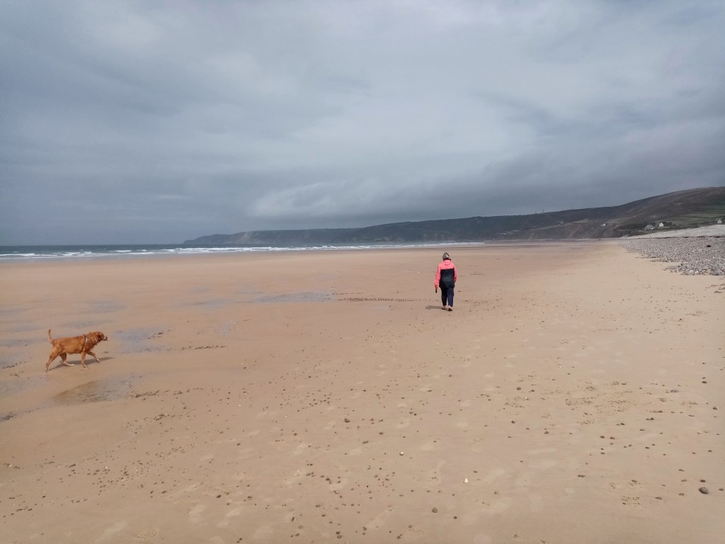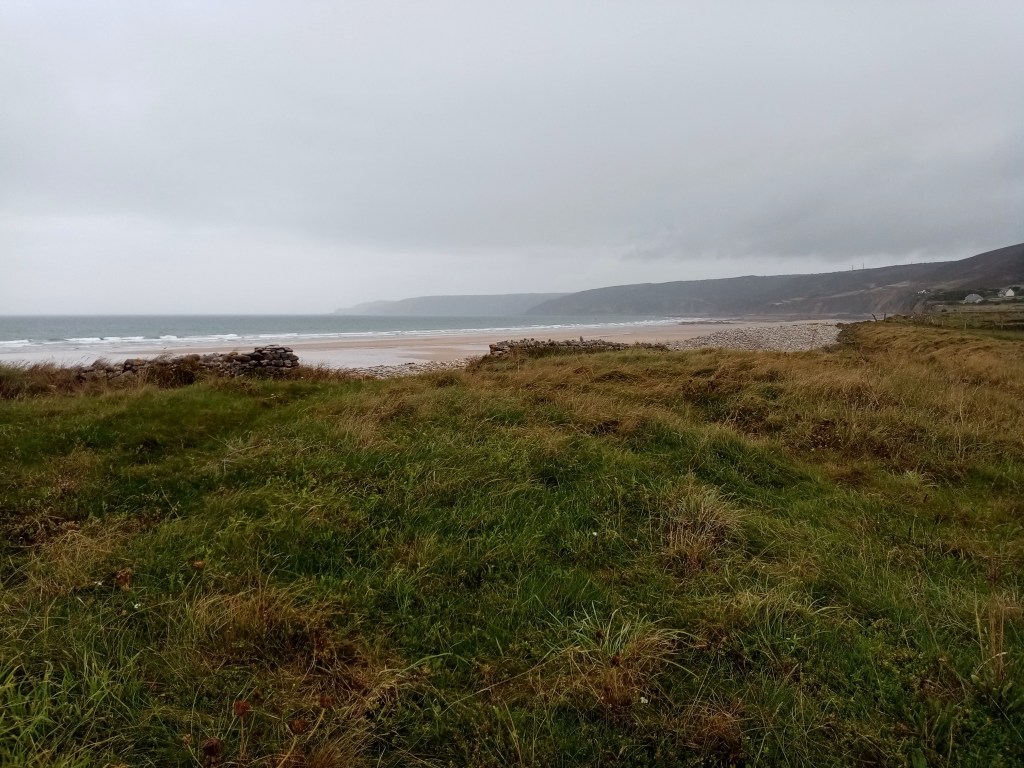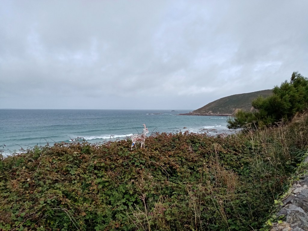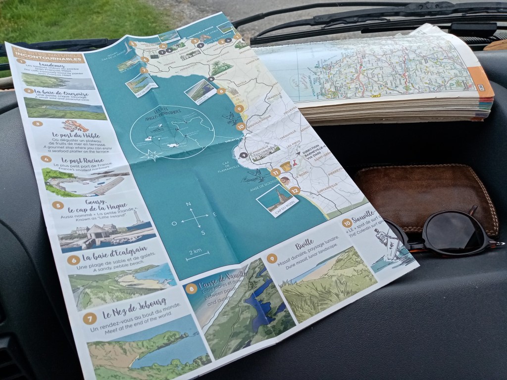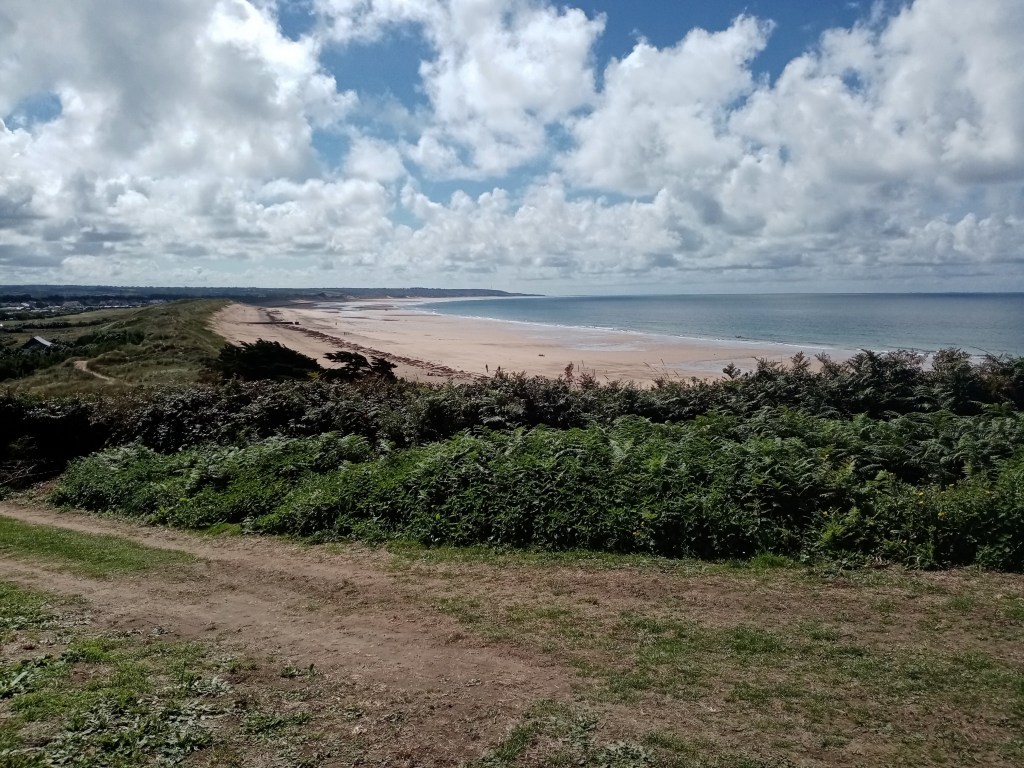 LUNEDÌ 14 AGOSTO. Ieri, giornata piena di sole, una vera rarità nei nostri viaggi in Normandia; ma stanotte ha piovuto con raffiche di vento. Ora è calmo, e partiamo senza fretta, l’obiettivo di oggi è il non lontano Castello di Flamanville. I km non sarebbero tantissimi ma scegliamo ancora una volta strade un po’ più impervie per seguire la costa cercando i punti di interesse segnalati su una mappa recuperata in campeggio. Seguendo la D401, Facciamo tappa ad ammirare la natura selvaggia della Baie d’Écalgrain e del Nez de Jobourg; poi risaliamo verso Jobourg ad incrociare la D901; proseguiamo costeggiando un immenso impianto elettronucleare per poi deviare di nuovo verso il mare all’altezza di La Hague, seguendo la D318 fino al bivio verso il parcheggio (gratuito) della spiaggia di Vauville. Sosta tattica per pranzo, mentre si scatena un acquazzone che smette con la stessa velocità con cui è arrivato; lunga passeggiata e nuovo acquazzone.