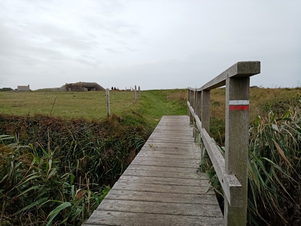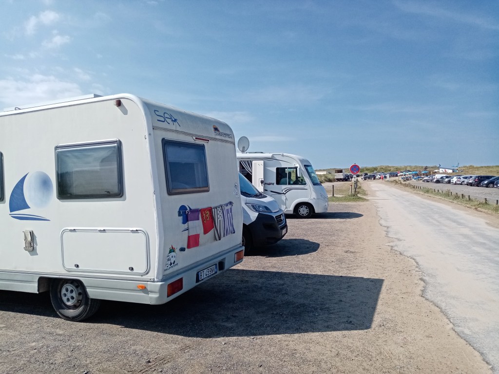 L’idea iniziale sarebbe quella di lasciarci tentare dal profumino che proviene dalla brasserie Le Roosevelt lì nei pressi del Museo, ma è strapieno. Perciò, torniamo al camper e ripartiamo, seguendo la D421 dietro la grande duna e in mezzo a prati e pascoli. Nel giro di 5 km la strada ritrova il mare e si viaggia su una specie di diga costiera: un vero spettacolo. Troviamo un piccolo slargo nei pressi dell’incrocio verso Fontenay-sur-Mer, e qui facciamo sosta tattica, seguita da una lunga passeggiata.