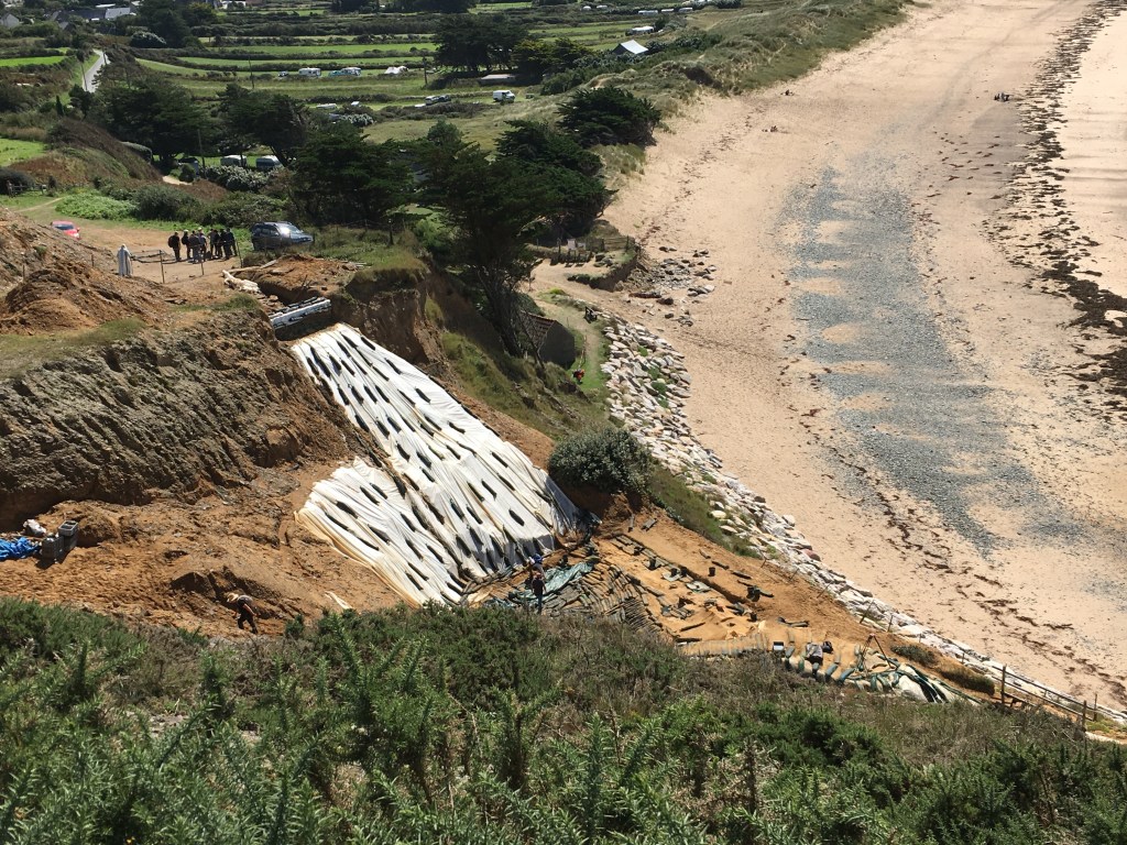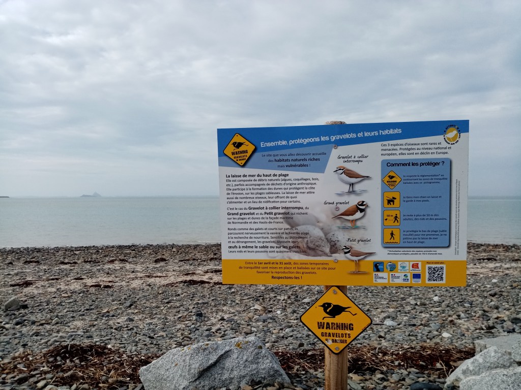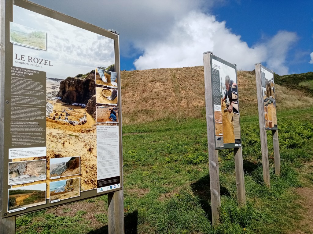 Verso le dieci e mazza ci rimettiamo in marcia, obiettivo Le Rozel, dove ci dovrebbero essere un castello e un’area di ritrovamenti paleolitici. Infatti, li troviamo entrambi: ma il castello è un resort e nell’area sono in corso scavi e non è ancora accessibile al pubblico. Però nel castello si può girare tranquillamente, e nei pressi degli scavi alcuni grandi pannelli illustrano la storia del ritrovamento e le caratteristiche dell’insediamento, che riusciamo a fotografare dall’alto della rupe che lo sovrasta. Nel sito, scoperto in maniera fortunosa negli anni ’60, sono state finora ritrovate quasi 300 impronte fossili di Neanderthal, associate ad abbondante materiale archeologico tra cui tracce di animali, che fanno pensare ad attività legate in qualche modo della lavorazione della carne e della pietra. La zona degli scavi si trova all’inizio della spiaggia di Sourtainville, ed è protetta da grandi teli. Non è stato facile raggiungere lo sterrato che funge da parcheggio della spiaggia, ma ne è valsa la pena, anche per la spettacolare vista che si gode dall’alto della scogliera.