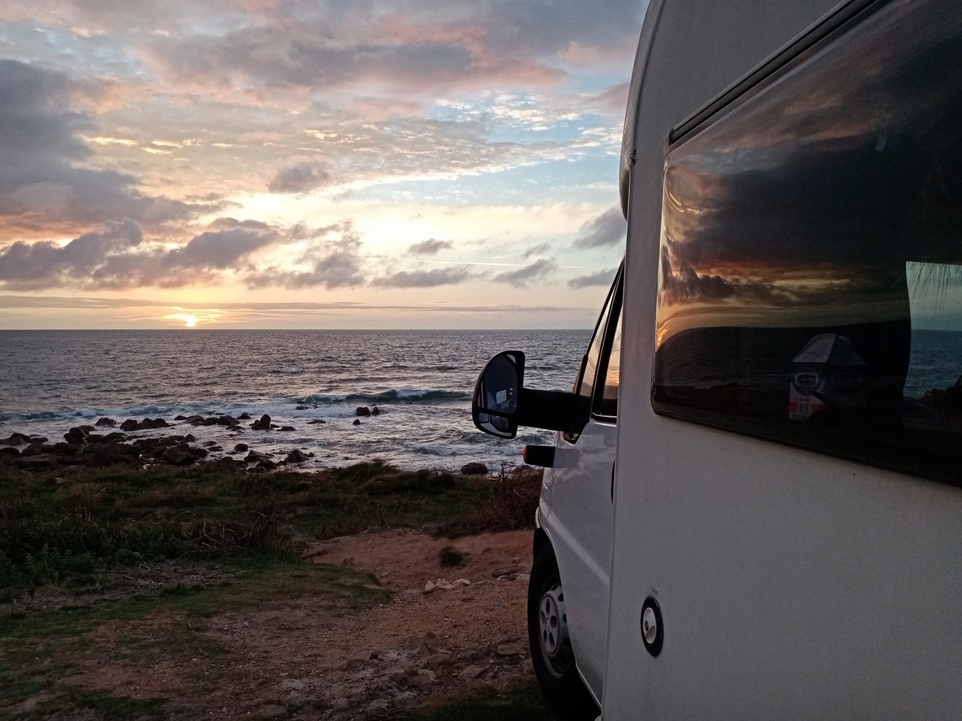 Verso le otto ritorniamo a baita. Nel parcheggio quasi deserto il Dinghy è sistemato in favore di tramonto, e dopo aver cenato ci godiamo questa vista attendendo la notte, illuminata dalla luce rossa del faro.