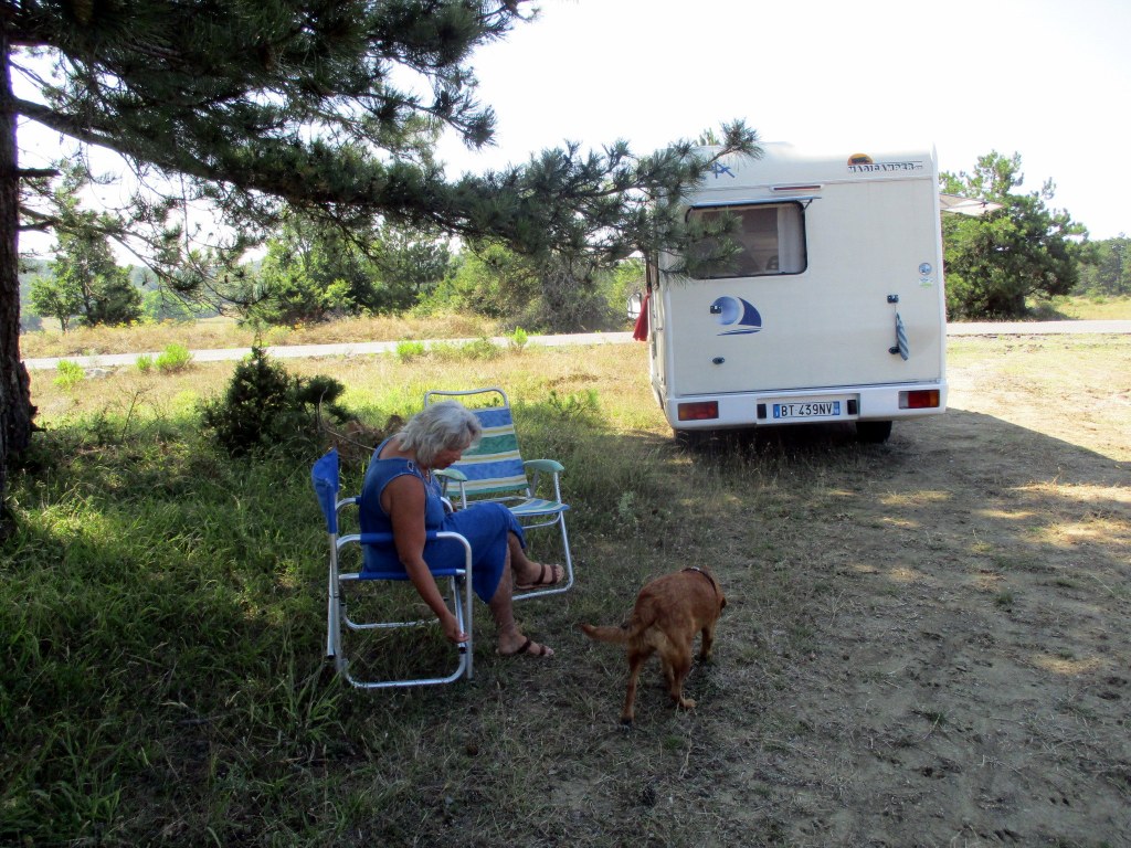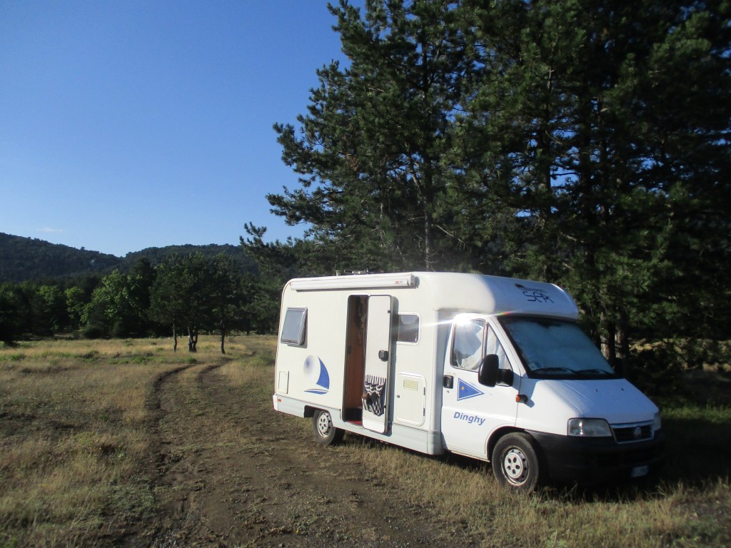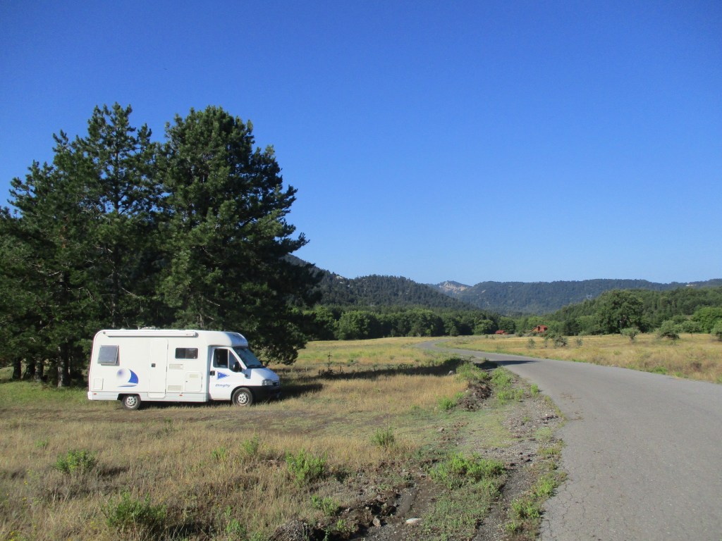 La fortuna aiuta gli audaci, superiamo un bivio ben segnalato verso uno dei tanti monasteri o chiese, e la decisione è presa: facciamo dietrofront, prendiamo questa stradina evidentemente battuta solo da mezzi agricoli e dopo pochi minuti troviamo uno slargo adatto con un angolo all’ombra. L’altimetro dice 820 metri. Passeggiamo tra i boschi e i prati. Due km più avanti lungo la strada c’è una costruzione molto in ordine, sembra una fattoria o un agriturismo, ma non c’è traccia di presenza umana. Nello spiazzo, dove si notano segni di pneumatici di trattore, niente acqua né servizi, ovviamente; ma impareggiabili le ore pomeridiane a cazzeggiare sotto un pino, la vista delle arnie in fondo alla conca, il suono dei campanacci e dei belati di pecore invisibili. E una splendida alba ricca di rugiada e di frescura.