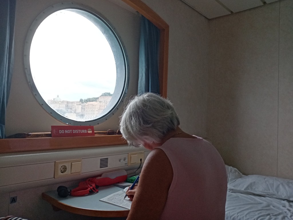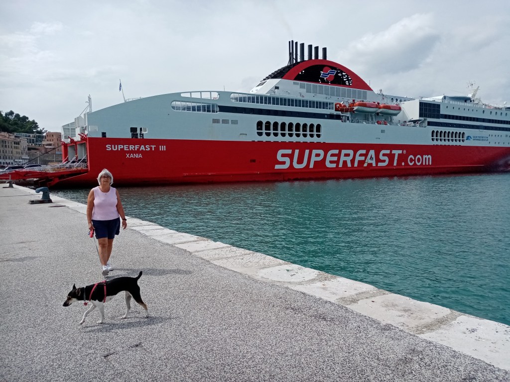2 SETTEMBRE, MARTEDÌ. Inizia il viaggio. La Grecia ci manca da tre anni, durante i quali sono successe molte cose per quanto riguarda i vettori. Il campeggio a bordo è stato definitivamente cancellato – ma in ogni caso l’esperienza del 2022 fu del tutto negativa, ed avevamo già stabilito di non usare più questa opzione. Le grandi e belle navi Minoan sono state dirottate da Grimaldi sulla linea per la Sardegna. E dunque, abbiamo scelto un passaggio in cabina con la Superfast III, una nave che si presenta moderna e confortevole, certamente più delle carrette che Grimaldi ha messo in partenza da Ancona. Qui invece nulla è cambiato sotto il sole, la viabilità è come al solito sconnessa e incasinata, il cosiddetto terminal ha sempre lo stesso aspetto precario. Novità positiva, le chiavi ci vengono consegnate al check in, e dunque non dovremo fare coda alla reception. Le operazioni di imbarco sono molto veloci; scopriamo con disappunto che per questioni di sicurezza non sarà possibile allacciare il camper alla corrente, e alle 12 prendiamo possesso della cabina esterna 8110, dotata di un immenso oblò. Nel quarto d’ora circa che trascorre tra l’ingresso in garage e l’ingresso in cabina, inevitabile il confronto con la Cruise Europa della Minoan, che fu la nostra nave per tantissimi anni, dal 2014 con l’opzione ultimo viaggio nel 2020: questa, varata nel 2000 e dunque dieci anni prima, presenta qualche segno di usura anche se alla fin fine regge bene l’età.