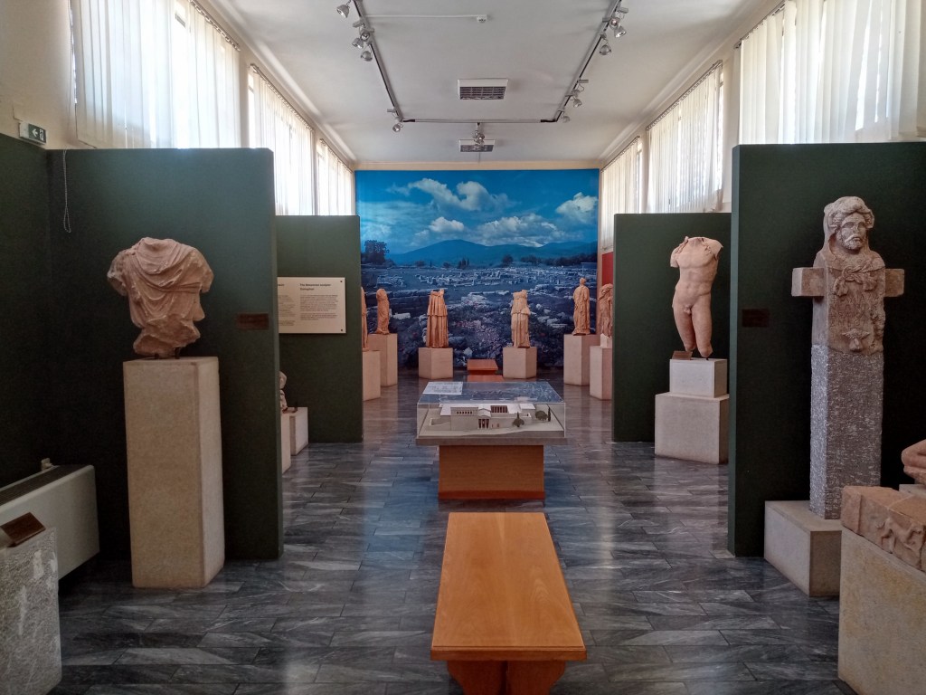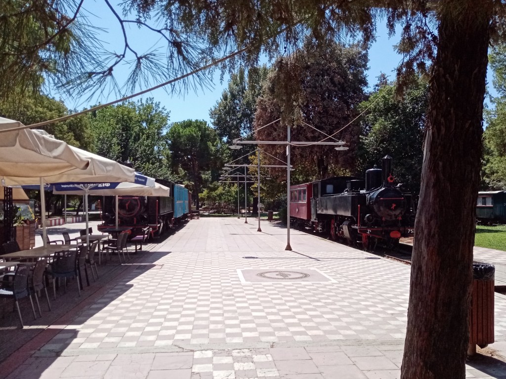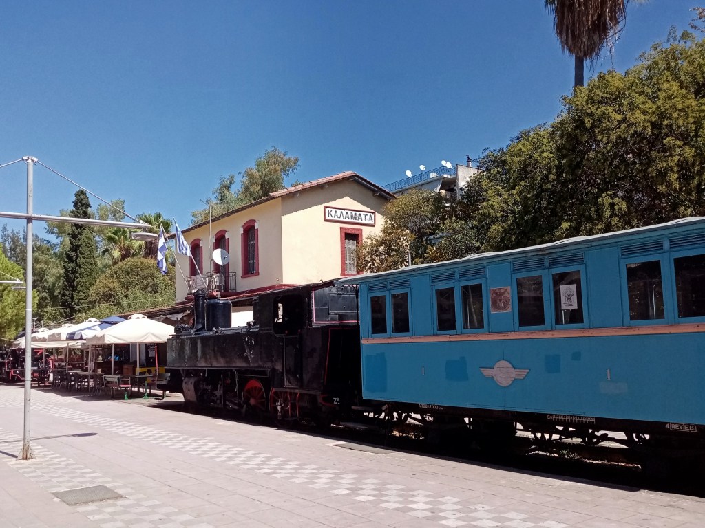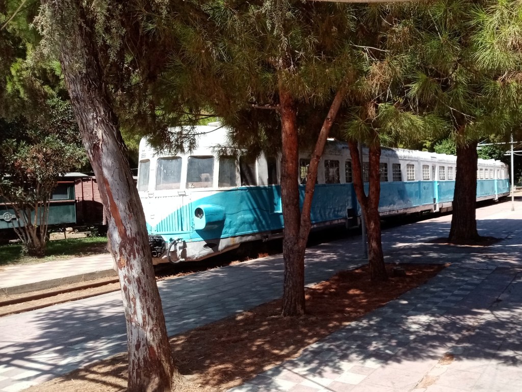 10 SETTEMBRE, MERCOLEDÌ. Vita da pensionati ben si concilia con vita da camperisti, ma siamo qui con due importanti obiettivi culturali. Il primo è il Parco Comunale della Ferrovia (Δημοτικό Σιδηροδρόμων Πάρκο), realizzato dall’amministrazione comunale nel 1986 intorno alla vecchia stazione OSE della città. Nel museo all’aperto, creato sulle banchine circondate da aiuole fiorite ed ampi spazi alberati, sono esposte una decina di locomotive a vapore e un paio di automotrici diesel Breda, identiche a quelle su cui avevo viaggiato nel lontanissimo 1975, oltre a carri merci e varie attrezzature ferroviarie. Un bel tuffo nel passato immerso nel profumo dei pini: quella stazione è una delle tante in cui feci tappa nel mio primo viaggio in Grecia, lontanissimo nel tempo, vicinissimo nel cuore.