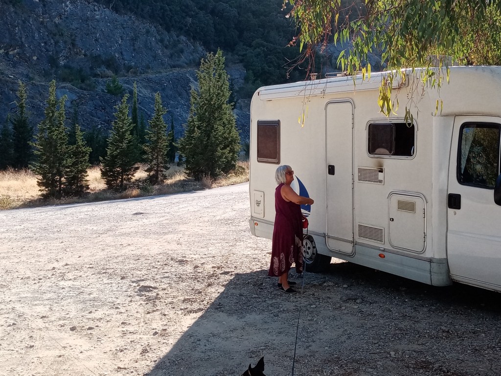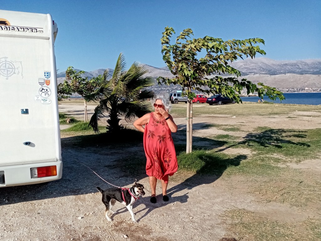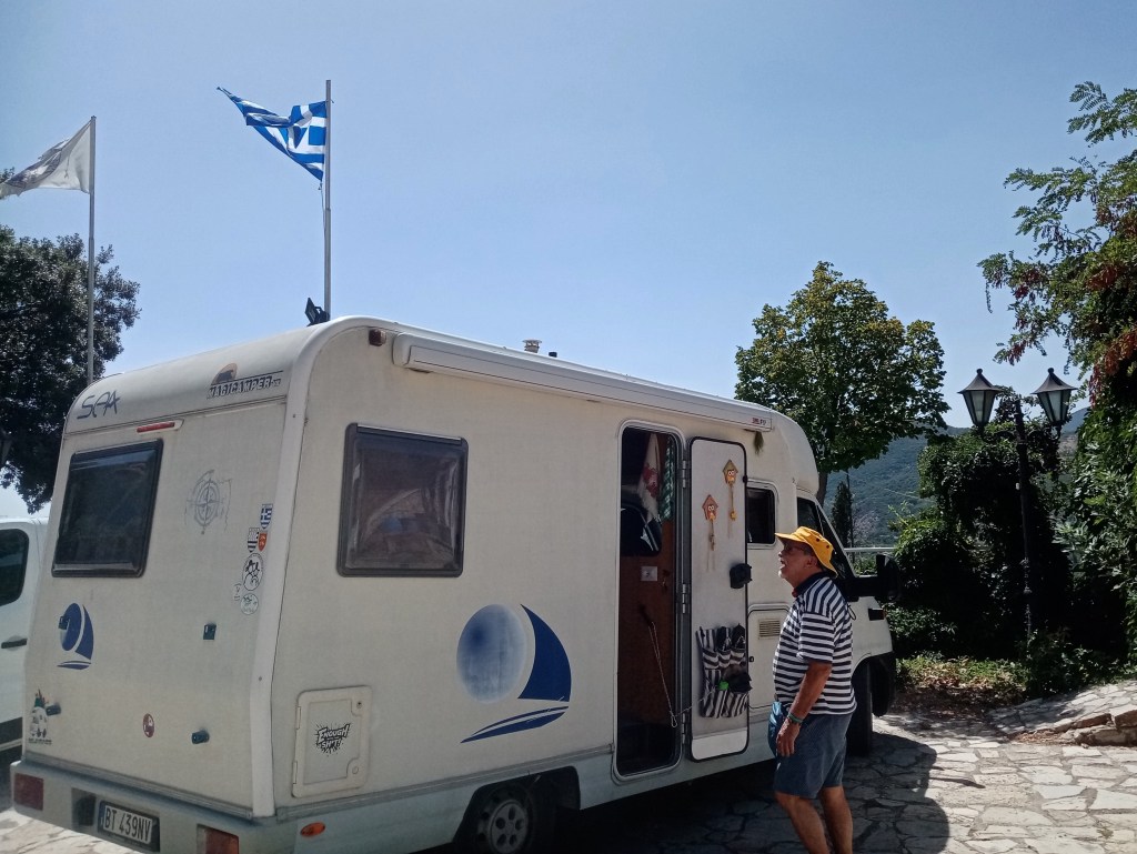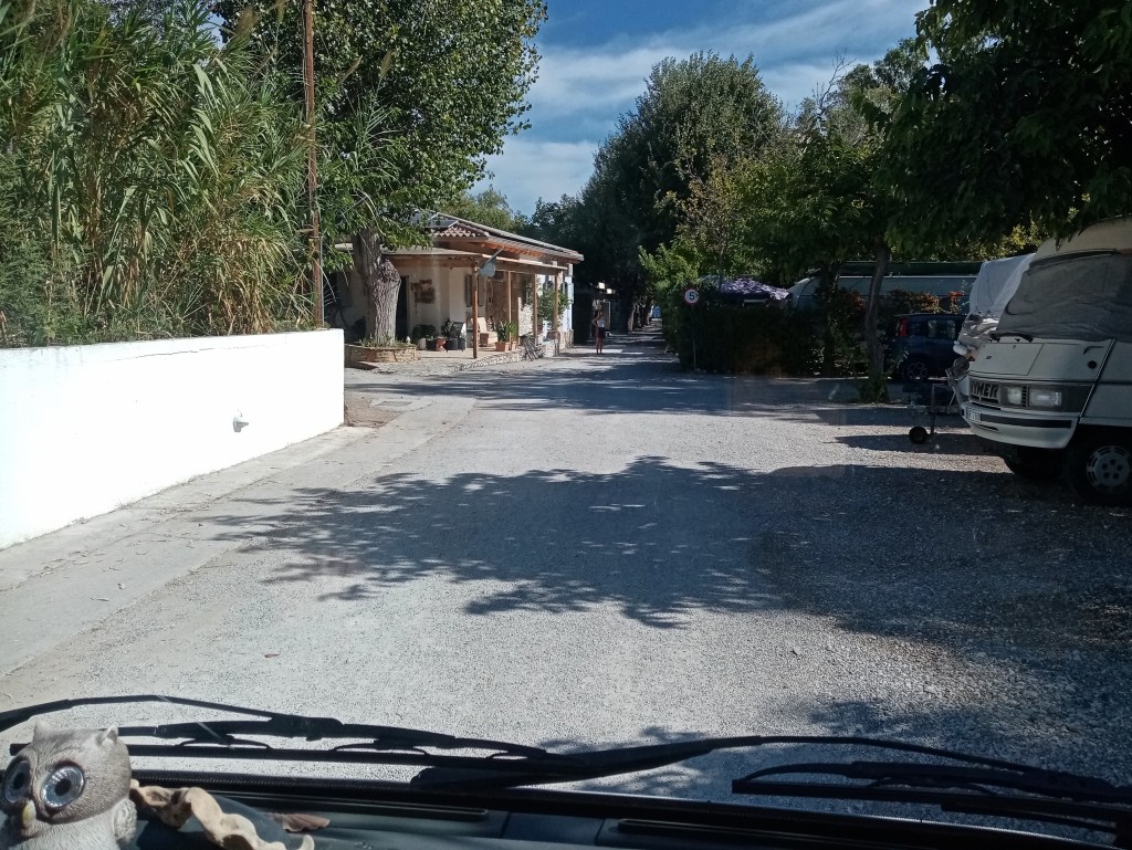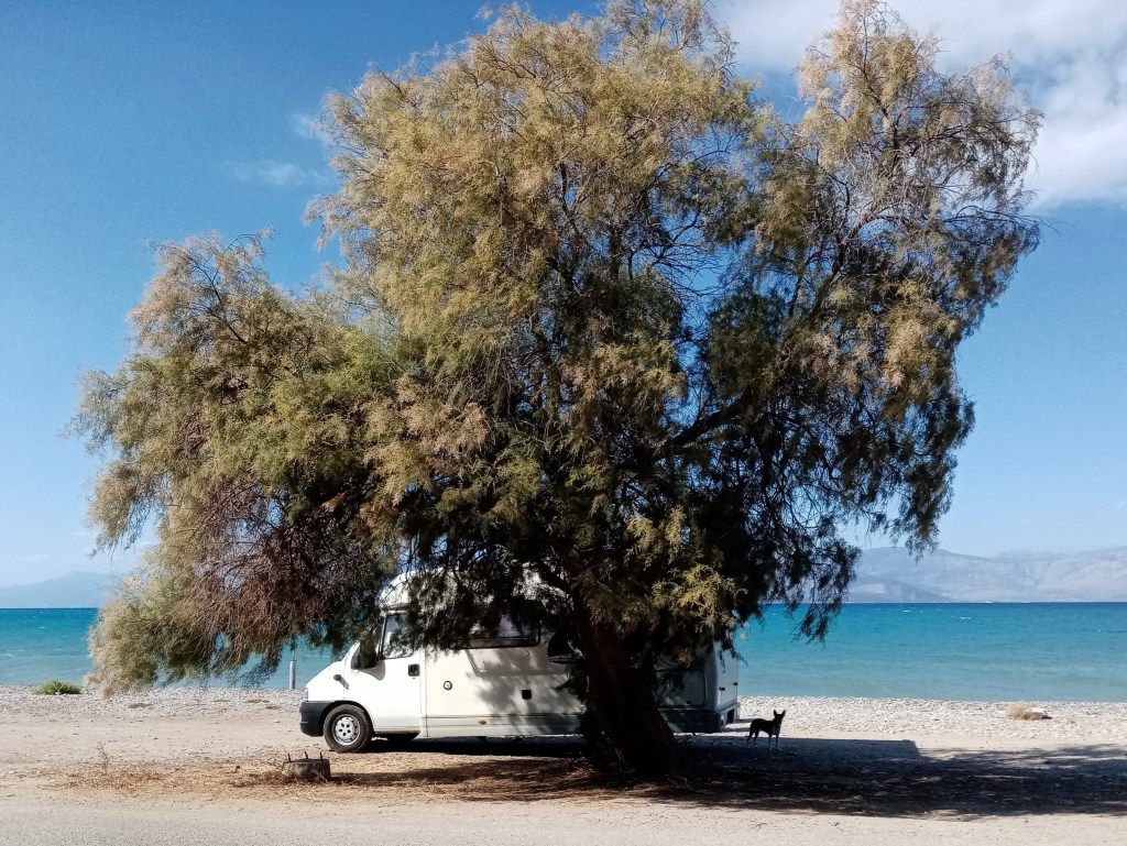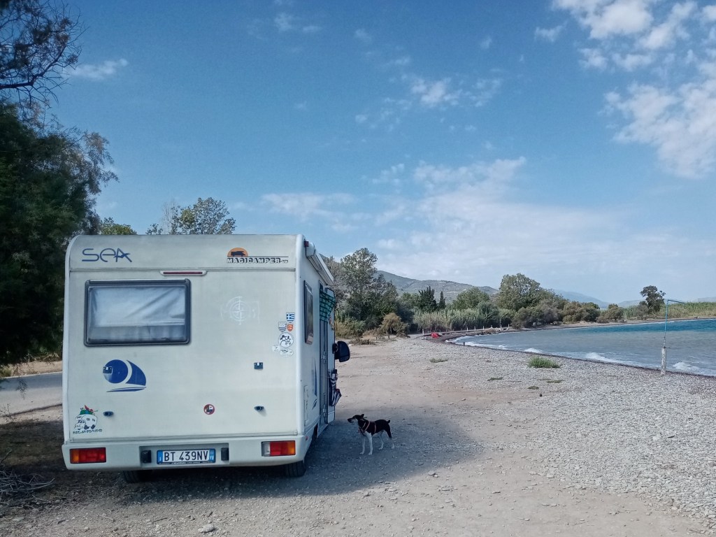 12 SETTEMBRE, VENERDÌ. Dormito tanto e bene, bel fresco dopo tanta calura, e dopo colazione Mirella propone di cambiare parcheggio. Dalle nostre passeggiate del 2019, ricordava spazi ben più ampi del piccolo sterrato davanti Agios Fanourios dove ci eravamo piazzati per un paio di notti l’altra volta, e dove a colpo sicuro ci siamo fermati ieri sera. Così facciamo, e in meno di un km raggiungiamo un larghissimo spiazzo, mettendo il Dinghy nel punto più lontano dalla strada, tra l’acqua e il bosco.
