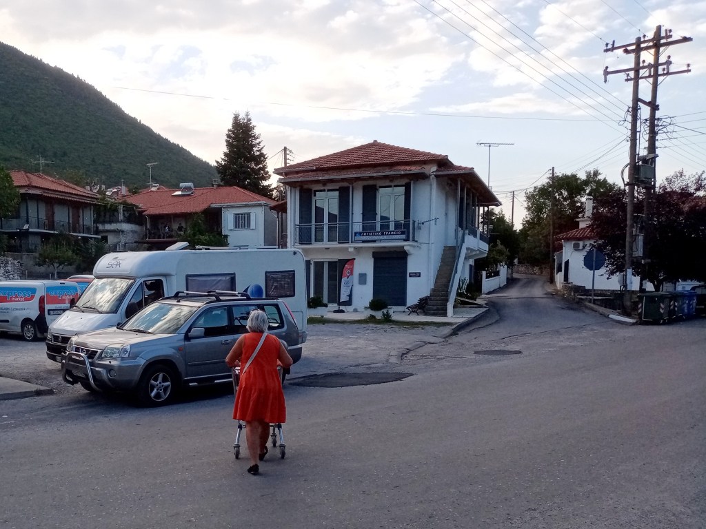 Sono ormai le tre e mezza quando lasciamo Mavrommati e riaccompagniamo Akis a Kalamàta. Sarebbe indispensabile una sosta tattica perché la nostra meta è abbastanza isolata, e siamo praticamente senza scorte. Invece, partenza a razzo via A7 verso nord, destinazione il fascinoso Limni Doxa, dove eravamo stati nel 2019. Memori di quel viaggio, vogliamo evitare di uscire a Tripolis, il cui attraversamento era stato abbastanza faticoso l’altra volta, e lasciamo l’autostrada a Nestani, dove intraprendiamo una infruttuosa ricerca di un supermercato, rischiando di perderci nei meandri delle vie e viuzze dell’altopiano intorno alla palude Stymfalia, completamente fuori strada rispetto al nostro obiettivo. Messo in campo un minimo di senso dell’orientamento, dietro front verso il primo incrocio che avevamo superato dopo l’uscita dalla A7, e per avventura (o per una gran botta di culo) ci troviamo a ripercorrere una strada battuta nel 2009 e a fermarci nella piccola ma animata città di Levidi, dove grazie a Dio è ancora aperto l’unico supermercato tra Tripolis e Stenò, lunga la vecchia Statale 111. Meno di 20 km se a Milià (2 km dall’uscita dell’autostrada) avessimo tirato diritto invece di svoltare a destra verso Mantinea – un luogo segnato sulla carta ma inesistente, e poi Artemisio, Orcòmeno, Kandyla, e via cercando per quasi 60 km.
